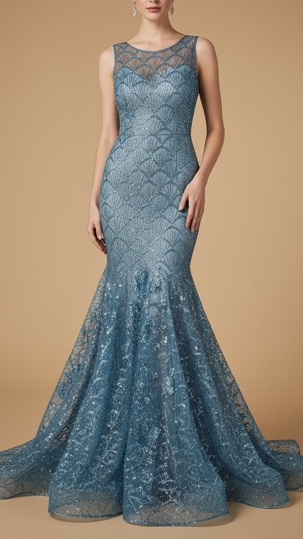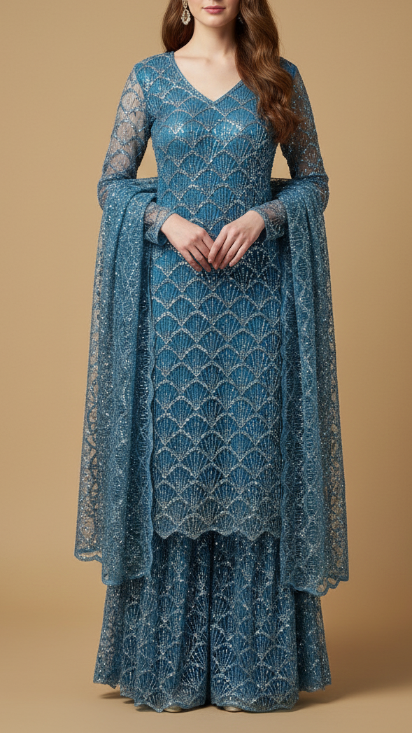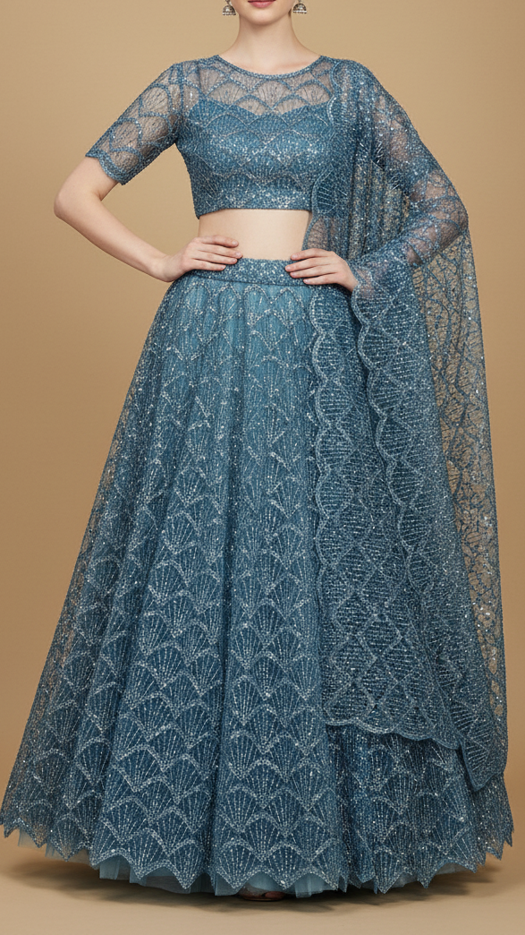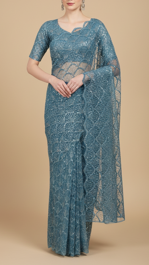 | Fabric Name | Ocean Blue Imported Net Fabric with Allover Bead & Sequins Work |
