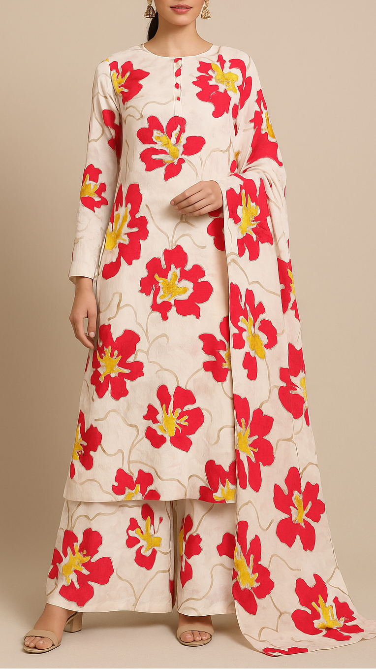 Ideal for sarees, lehengas, suits, and gowns, this fabric works beautifully for both traditional and contemporary styles. Its neutral tone with floral accents and sparkle makes it suitable for weddings, parties, and sophisticated day-to-evening outfits.