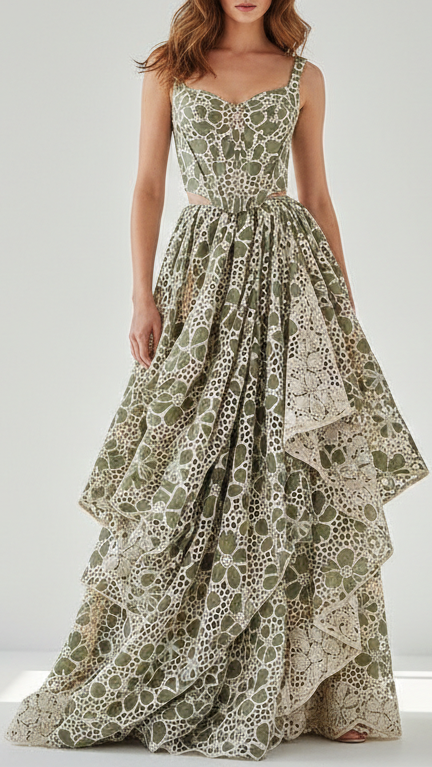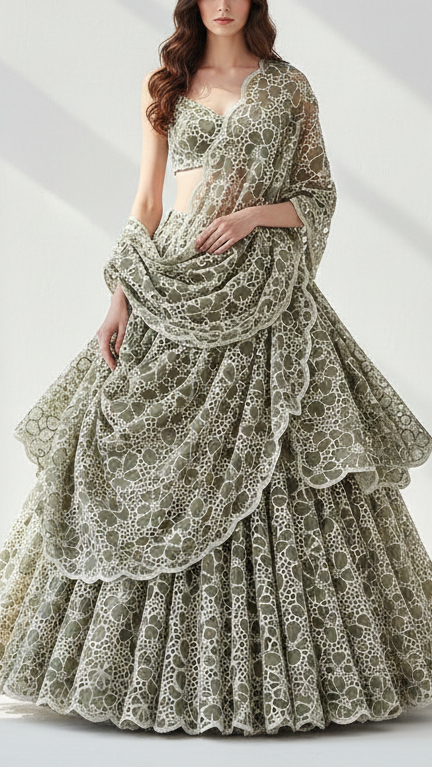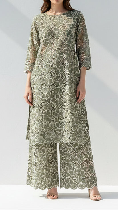 | Fabric Name | Olive Green Cotton Fabric With All Over Thread And Cutwork With Scalloped Edges |
