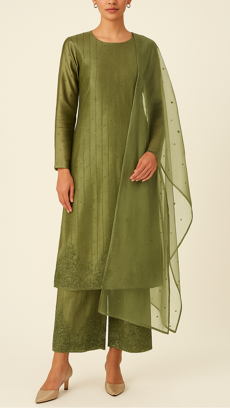 Fabric Name | Olive Green Imported Organza Satin Fabric With All Over Sequins, Katdana And Bead Work With One Side Heavy Border |