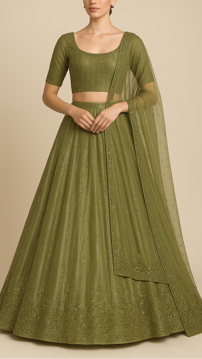 Olive Green Imported Organza Satin Fabric With All Over Sequins, Katdana And Bead Work With One Side Heavy Border 16431