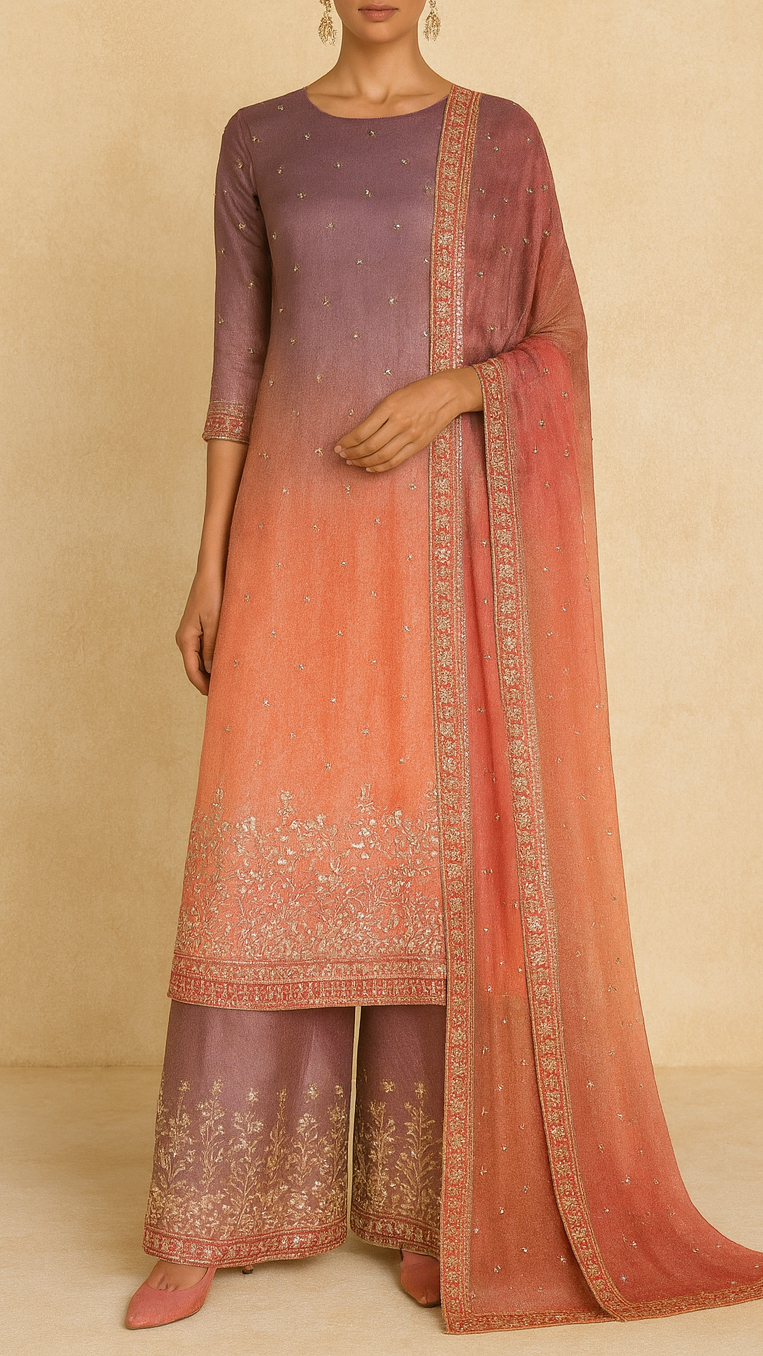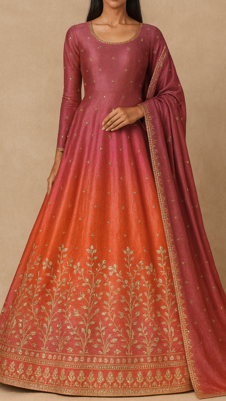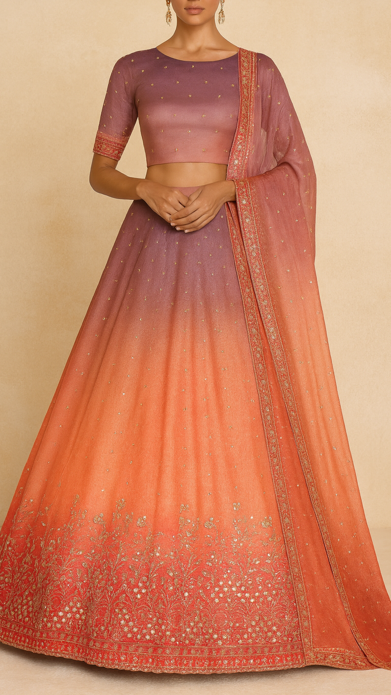 Orange And Pink Tissue Ombre Fabric With All Over Faux Mirror, Bead, Sequins, Katdana Buti And One Side Heavy Border 19539