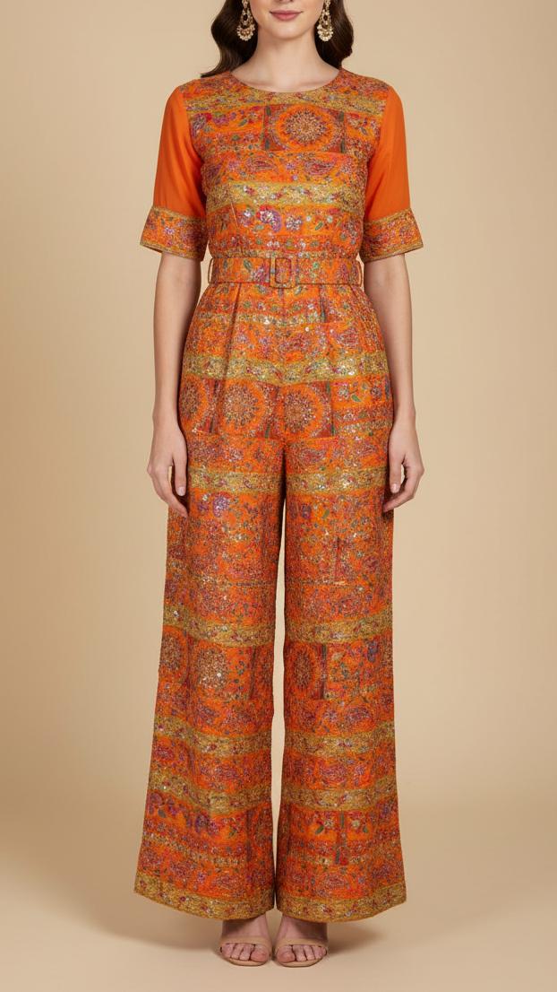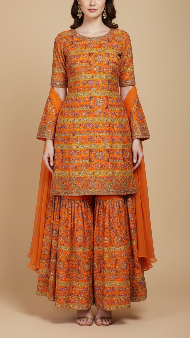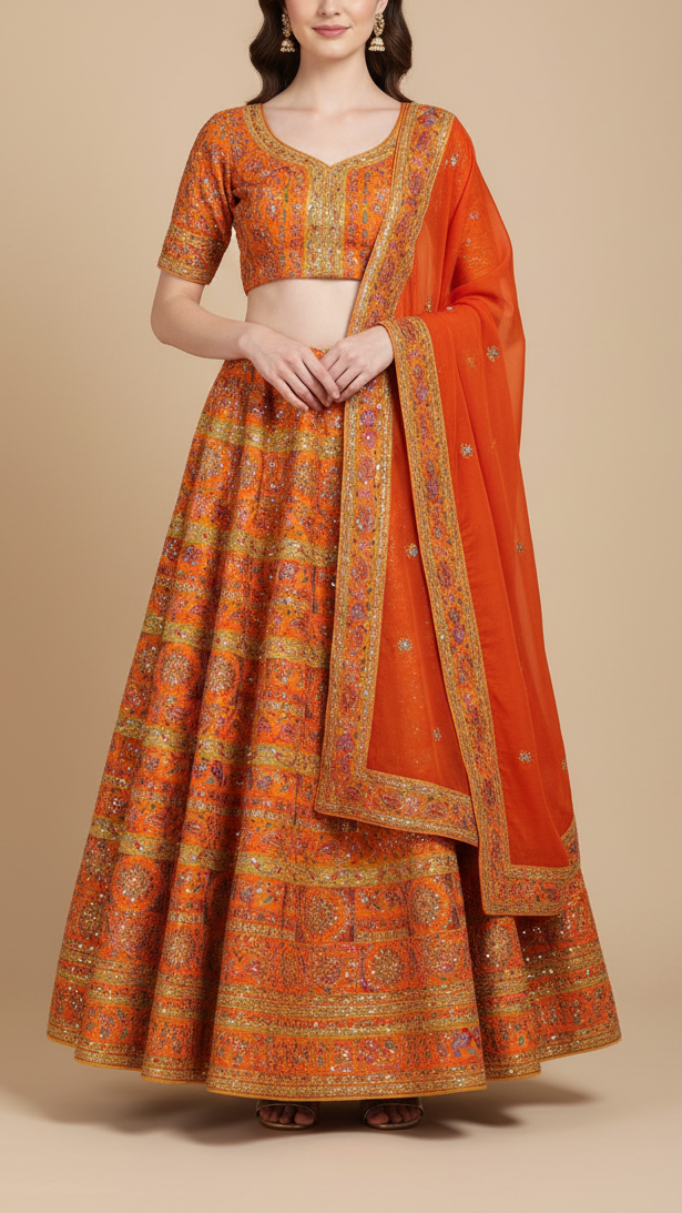 | Fabric Name | Orange Crepe Fabric With All Over Traditional Print With Thread And Zari Handloom |