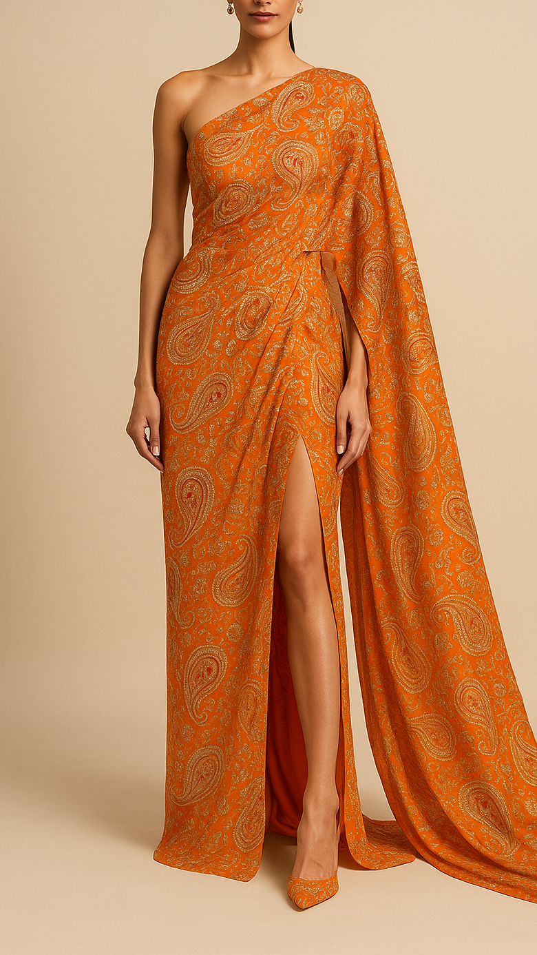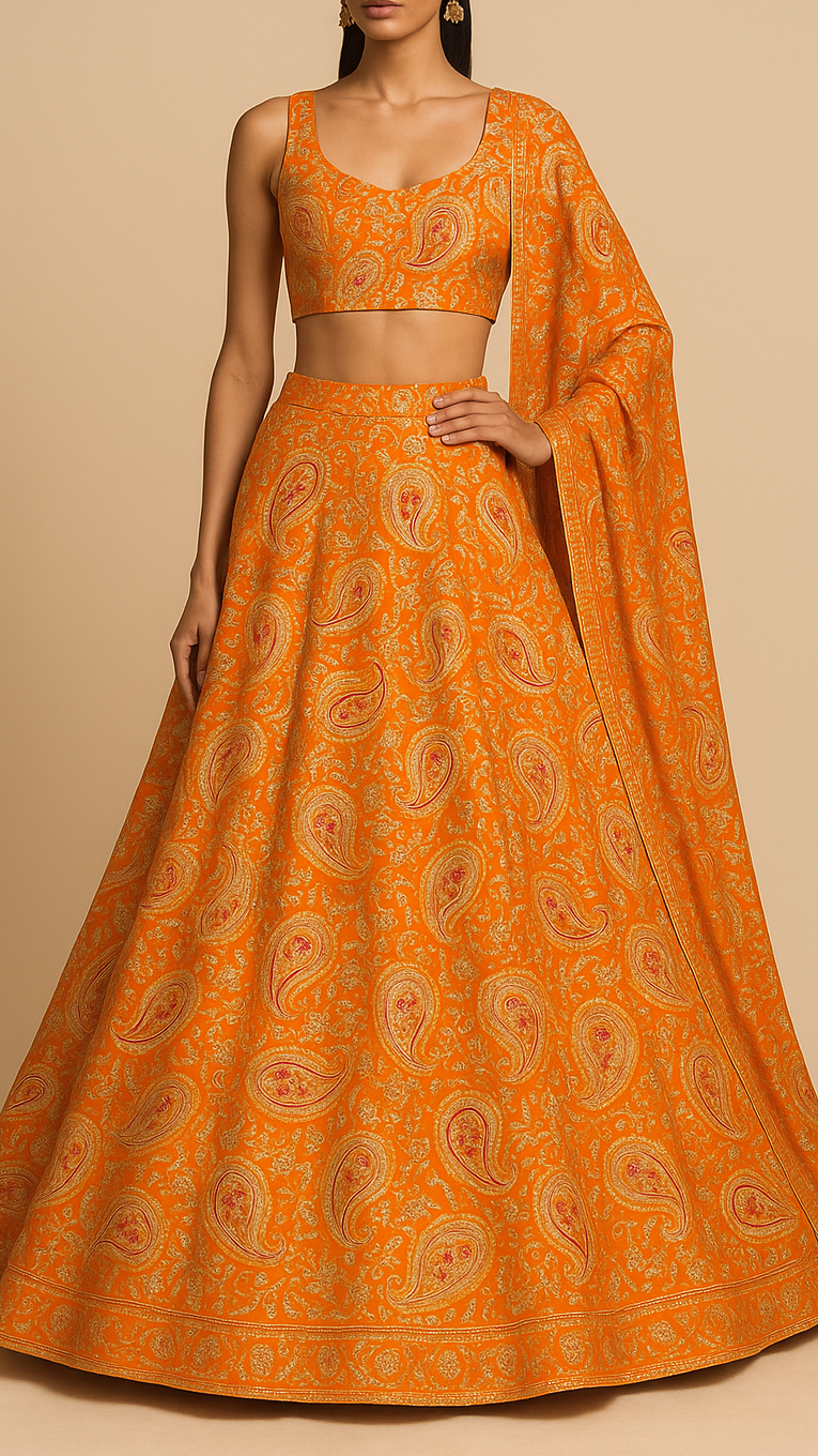 | Fabric Name | Orange Crepe Fabric With All Over Traditional Print With Zari And Sequins Work |