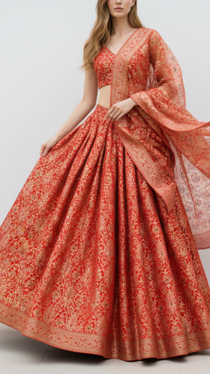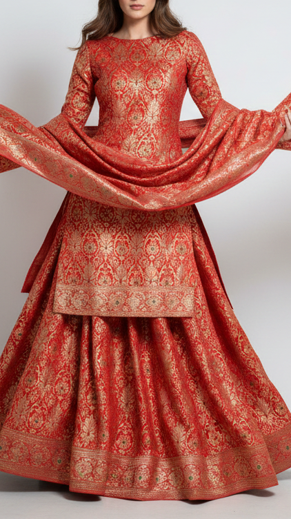 Banarasi Brocade Fabric with Allover Golden Zari Handloom is a timeless choice for creating luxurious and elegant pieces. Its rich texture and intricate zari Work make it perfect for bridal and wedding wear such as lehengas, sarees, and regal gowns. This fabric is equally suited for traditional ensembles like anarkalis, salwar suits, and sherwanis, adding a touch of grandeur to festive occasions