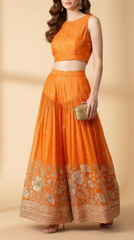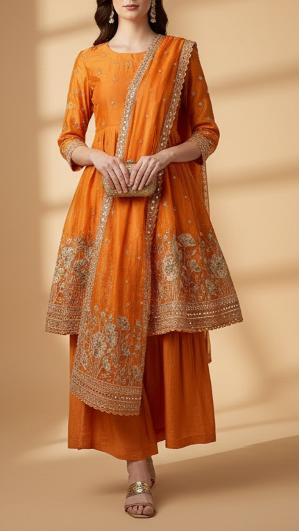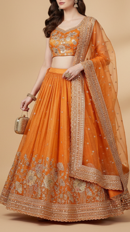 | Fabric Name | Orange Tissue Fabric With All Over Buti Of Bead, Sequins And Katdana With One Side Patch Work Border |