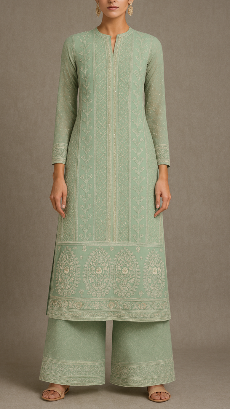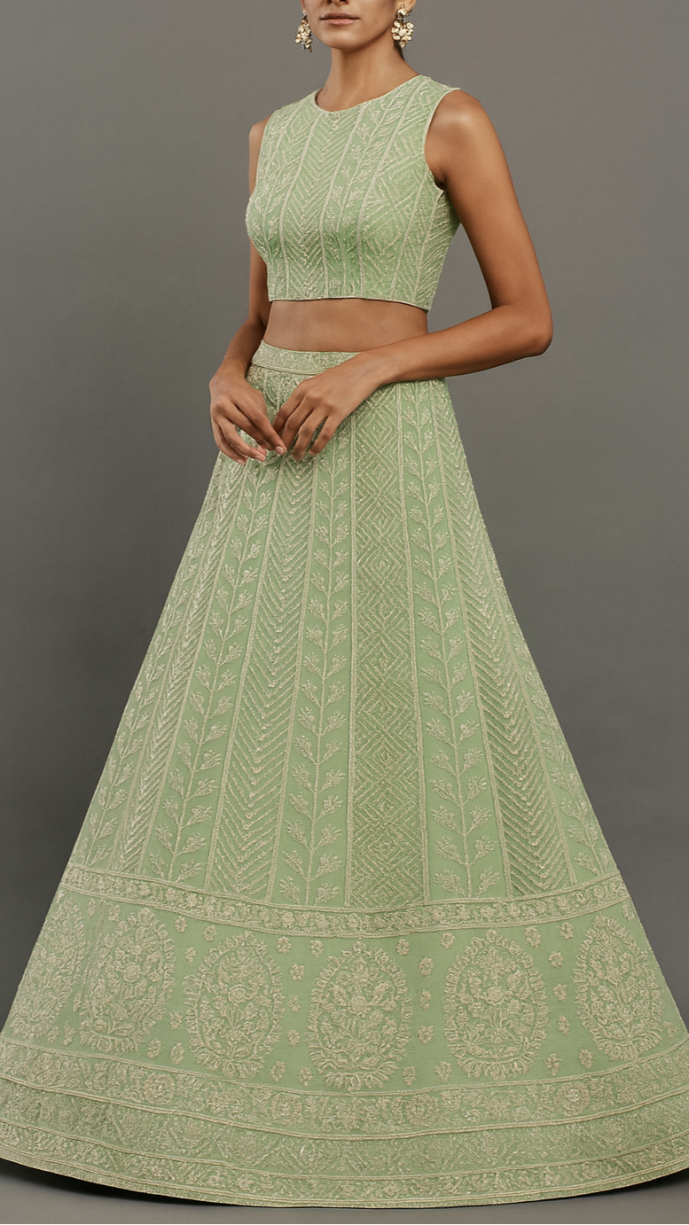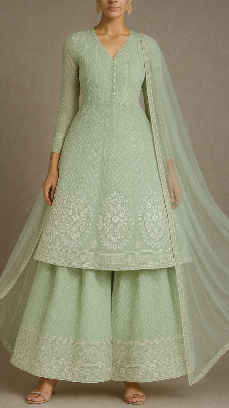 | Fabric Name | Pastel Green Georgette Fabric With All Over Thread, Sequins And Bead Work With One Side Border |