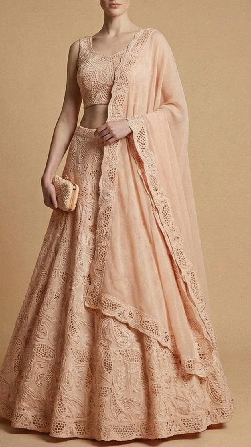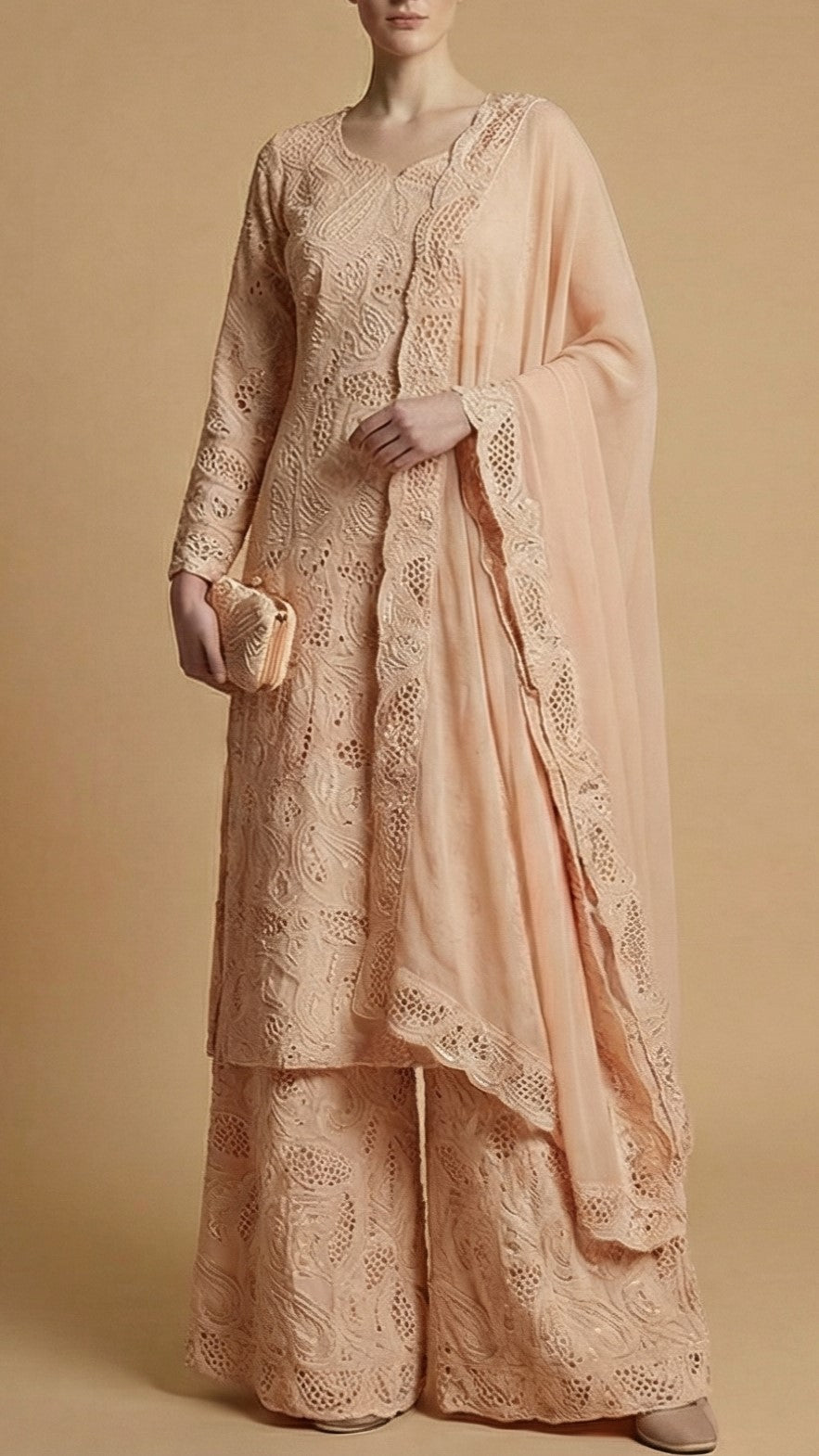 | Fabric Name | Peach Imported Crepe Fabric With All Over Cutwork |