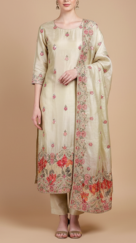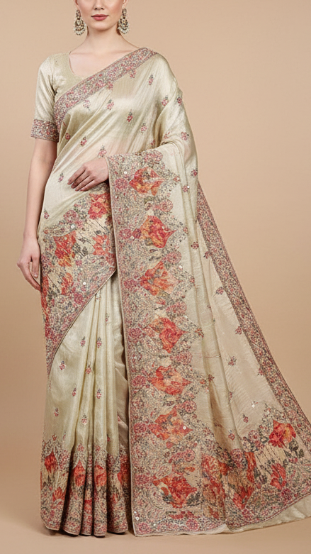 | Fabric Name | Peach Pink Tissue Fabric With All Over Buti Of Thread, Sequins And Katdana With One Side Heavy Work Border |