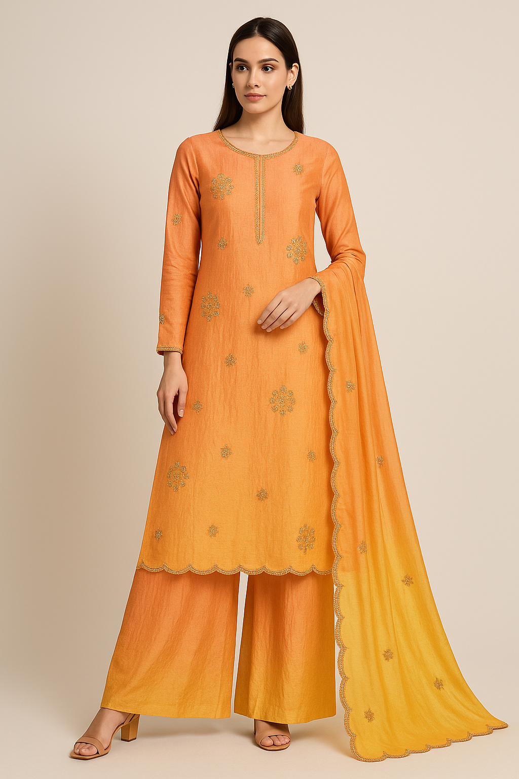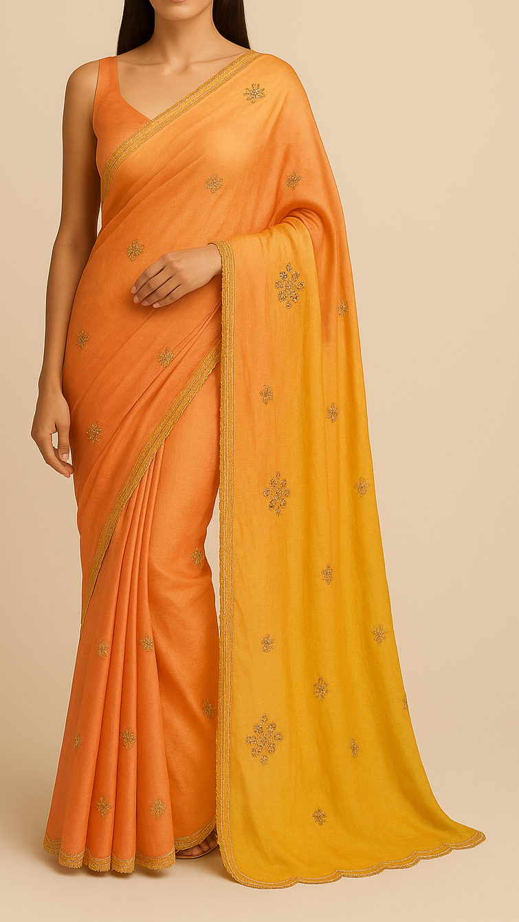 | Fabric Name | Peach & Yellow Tissue Ombre Fabric With All Over Zari, Sequins And Bead Work With Two Side Scalloped Border |
