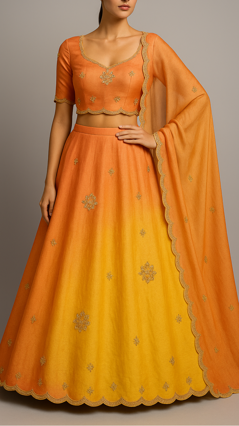 Perfect for sarees, lehengas, gowns, and dupattas, this fabric enhances both contemporary and traditional designs. The ombre shading combined with elegant embellishments and scalloped borders makes it suitable for weddings, receptions, and festive occasions, ensuring standout drapes and statement outfits.