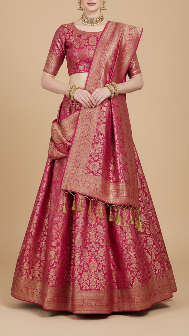 | Fabric Name | Pink Banarasi Brocade Fabric with Allover Golden Zari Handloom |