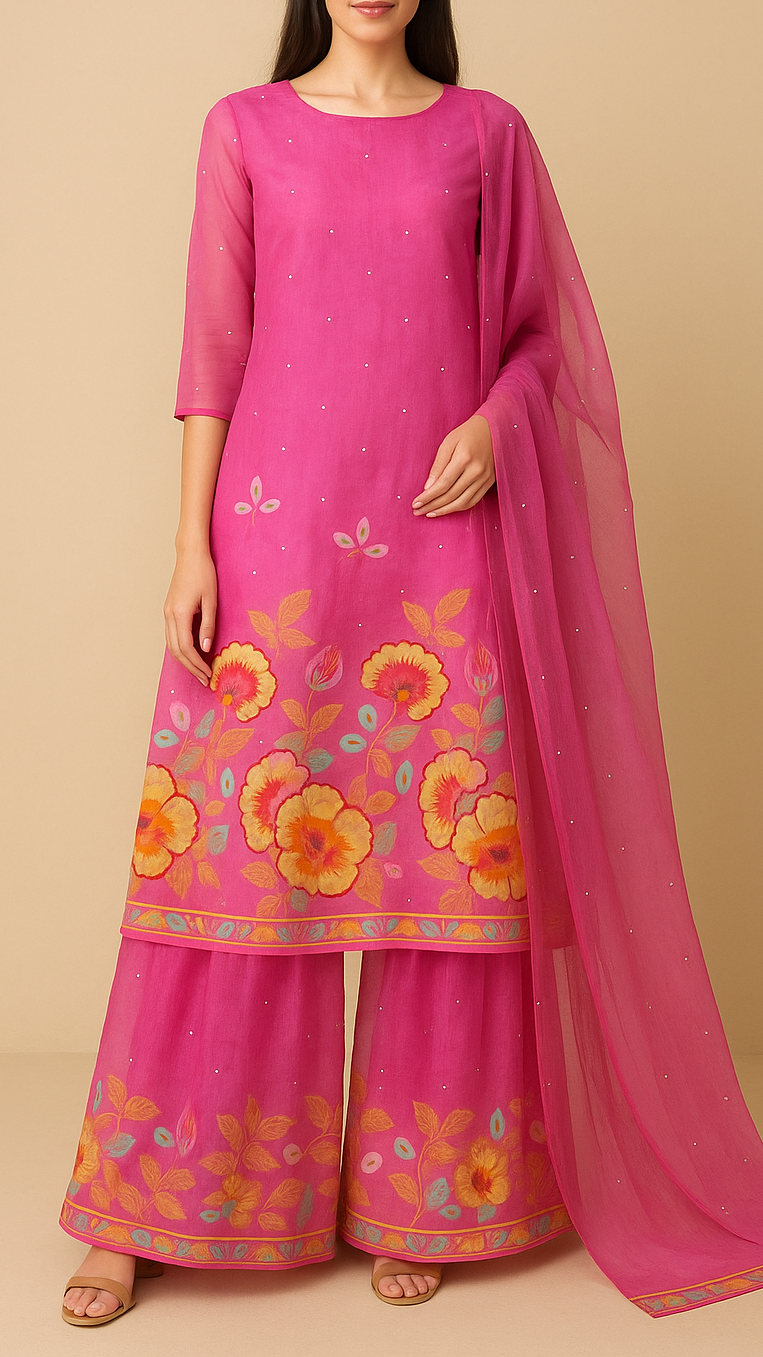 | Fabric Name | Pink Georgette Printed Fabric Embellished with Pearl, Sequins and Katdana Work With One-Side Border |