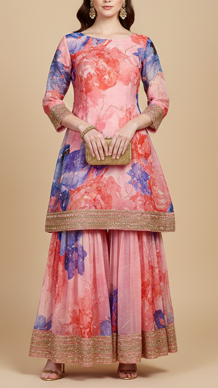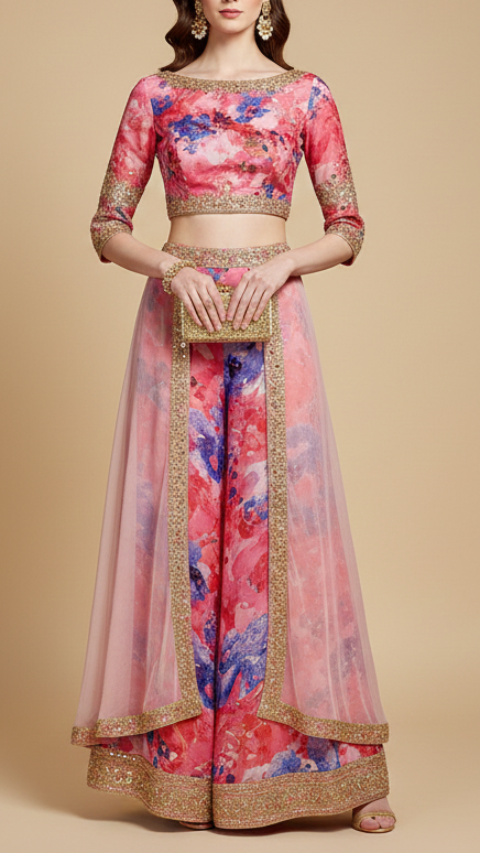 | Fabric Name | Pink Organza Fabric with All-Over Print, Katdana and Pearl Work |