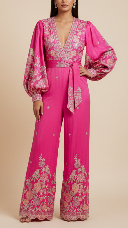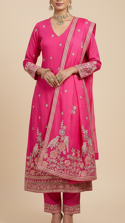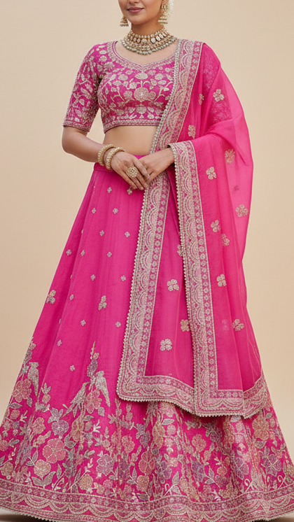 | Fabric Name | Pink Organza Fabric With All Over Thread, Sequins And Katdana Work With One Side Scalloped Border |