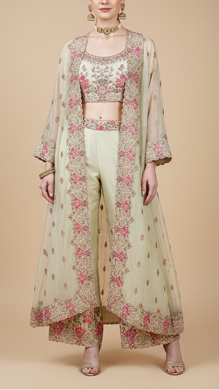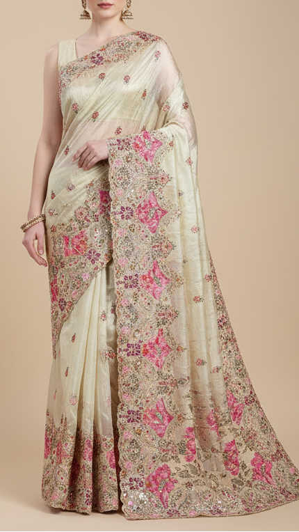 | Fabric Name | Pink Tissue Fabric With All Over Buti Of Thread, Sequins And Katdana With One Side Heavy Work Border |