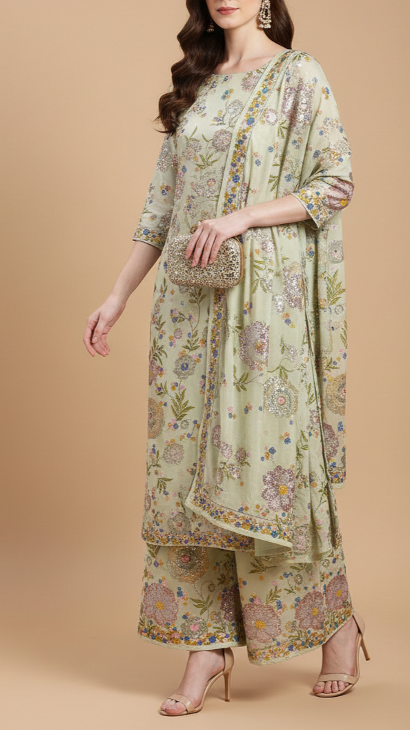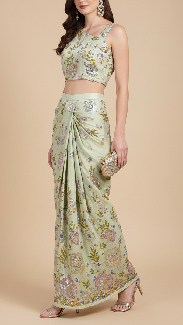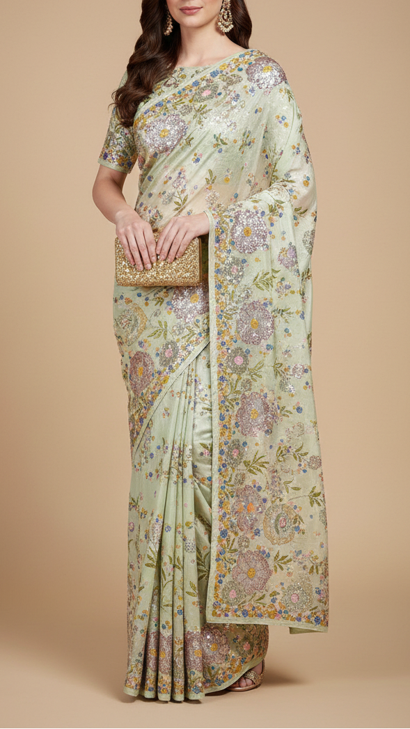 | Fabric Name | Pista Green Georgette Fabric With All Over Thread, Zari And Sequins With One Side Border |