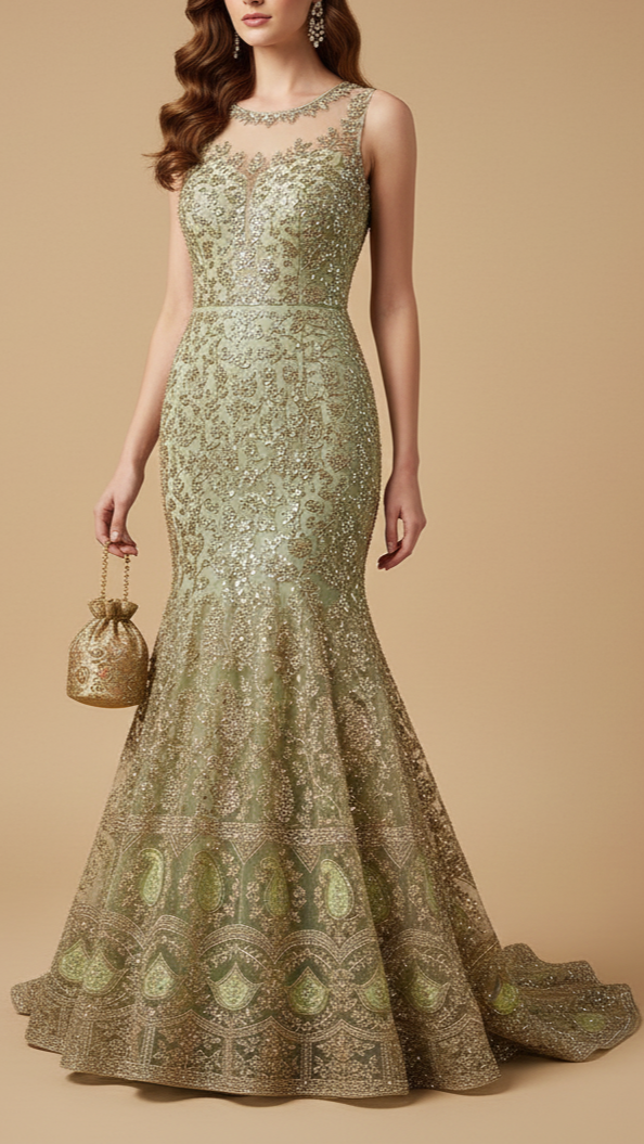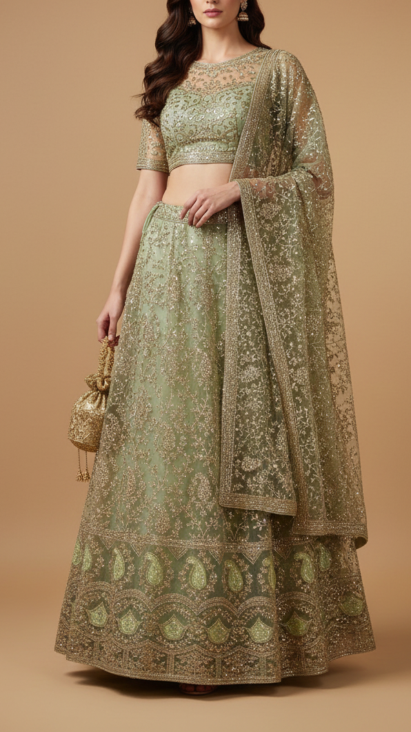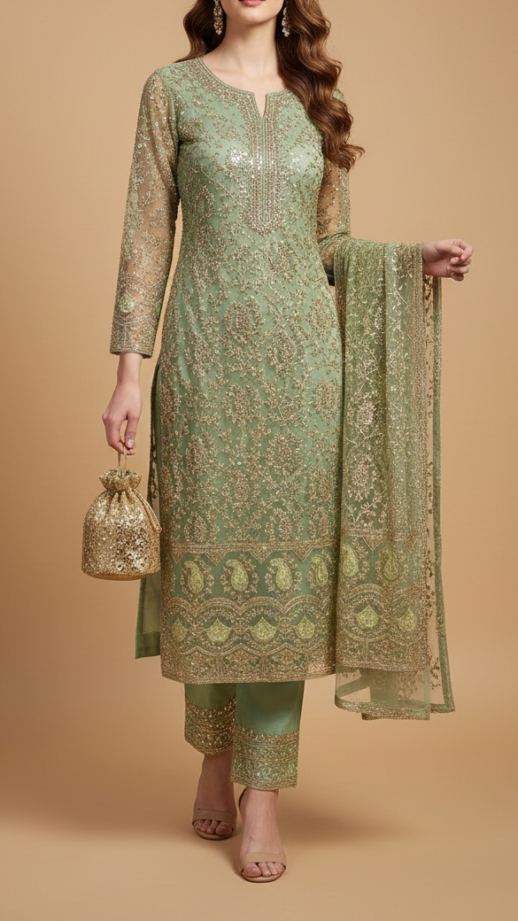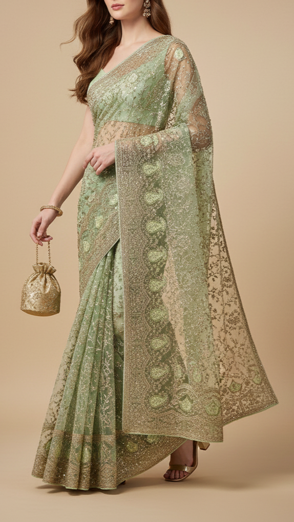 | Fabric Name | Pista Green Imported Net Fabric With All Over Sequins, Katdana And Bead Work With One Side Patch Work Border |