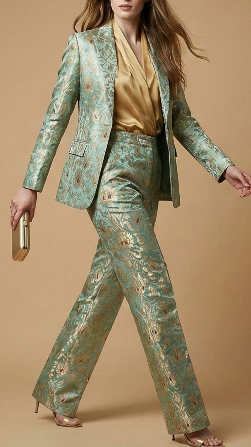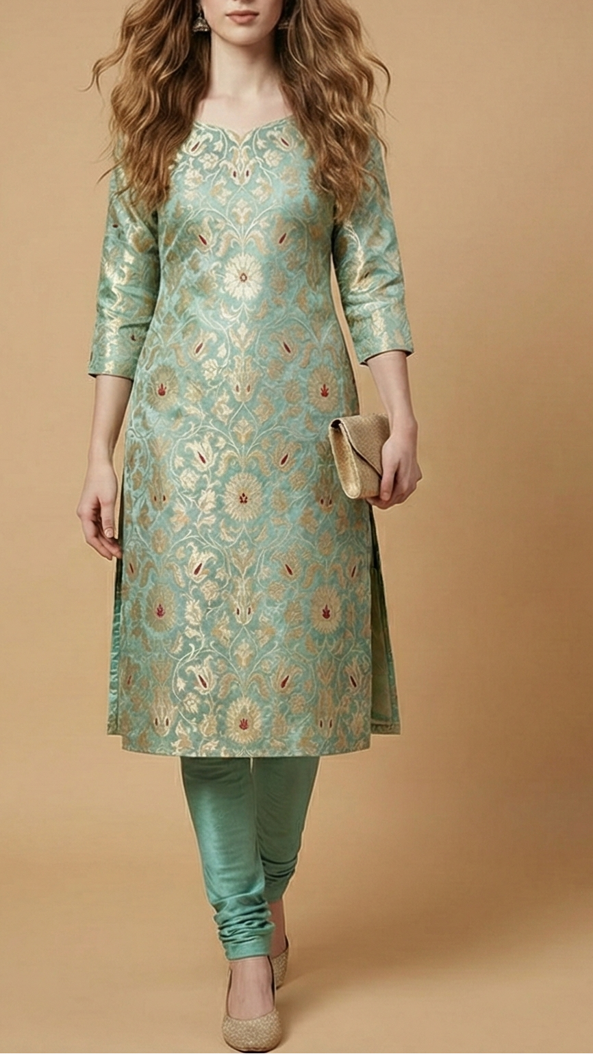 Ideal for sarees, lehengas, blouses, sherwanis, and ethnic jackets, this fabric captures the essence of royal tradition. Its detailed thread and golden zari weaving make it a perfect choice for weddings, receptions, and festive occasions.
