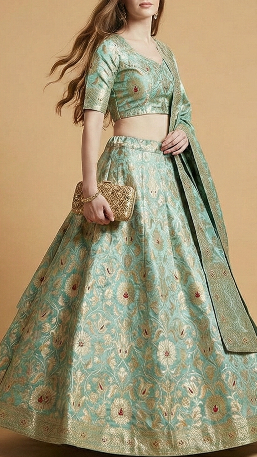 | Fabric Name | Pista Green Pure Banarasi Brocade Fabric With All Over Thread And Golden Zari Handloom |