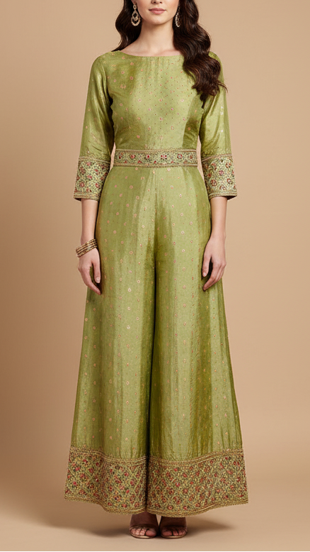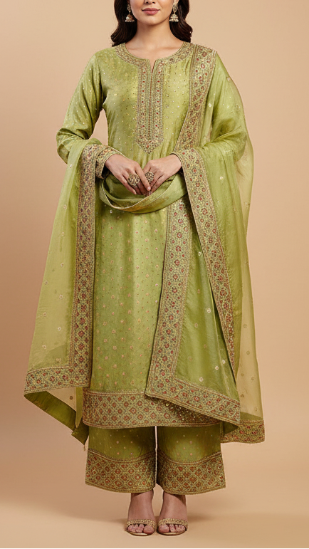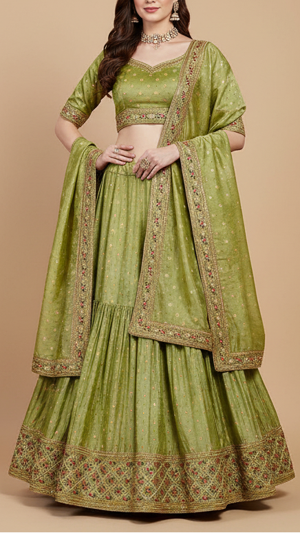 This exquisite pista green silk fabric with all-over zari handloom work and a one-side heavy border is perfect for creating luxurious sarees, lehengas, dupattas, statement blouses, kurtas, and even festive menswear like sherwanis or waistcoats.