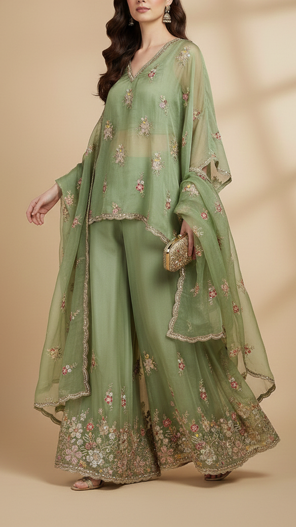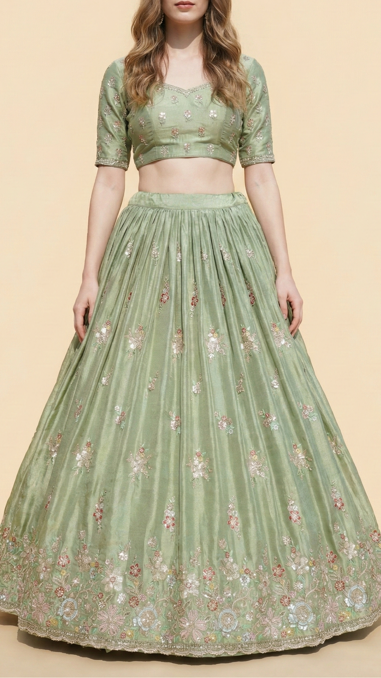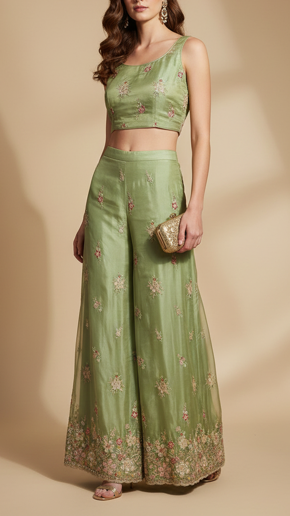 | Fabric Name | Pista Green Tissue Fabric With All Over Buti Of Bead, Sequins And Thread With One Side Heavy Border |