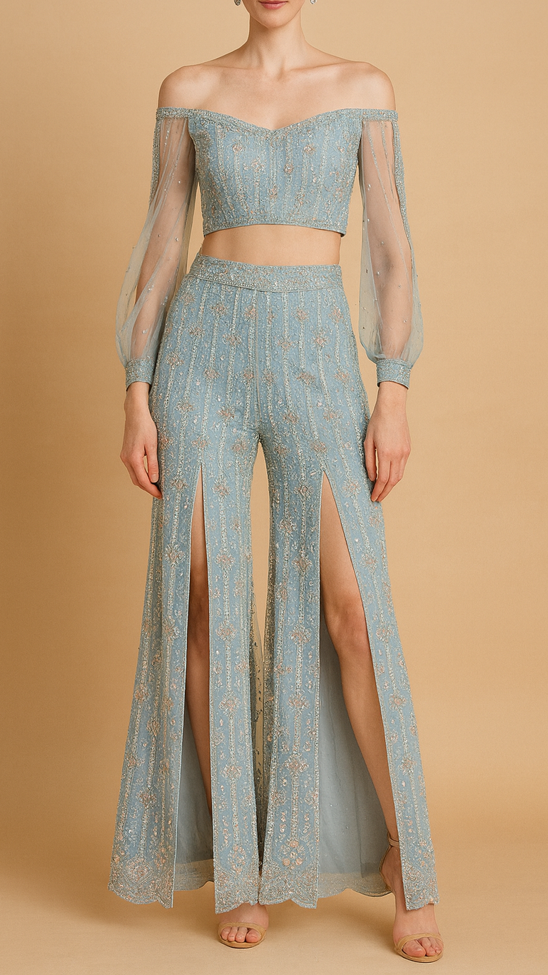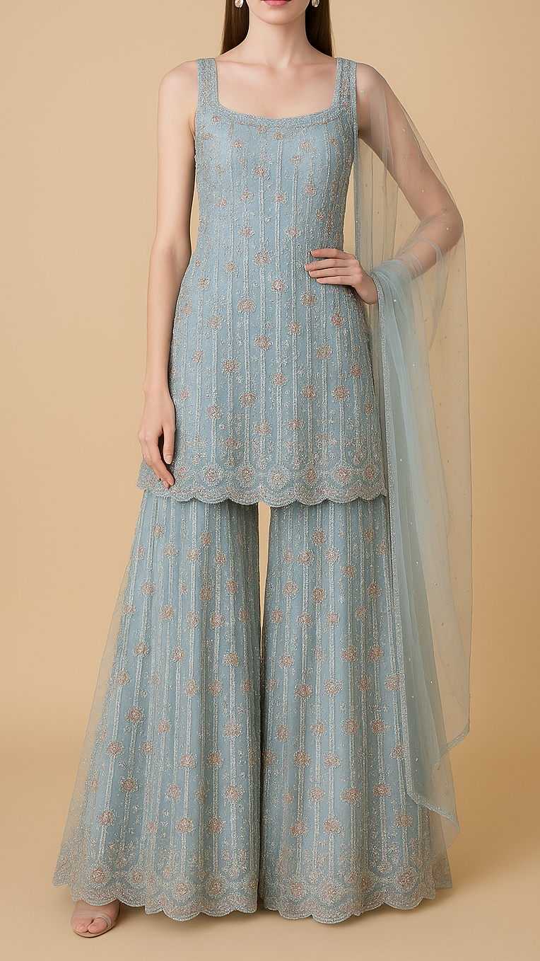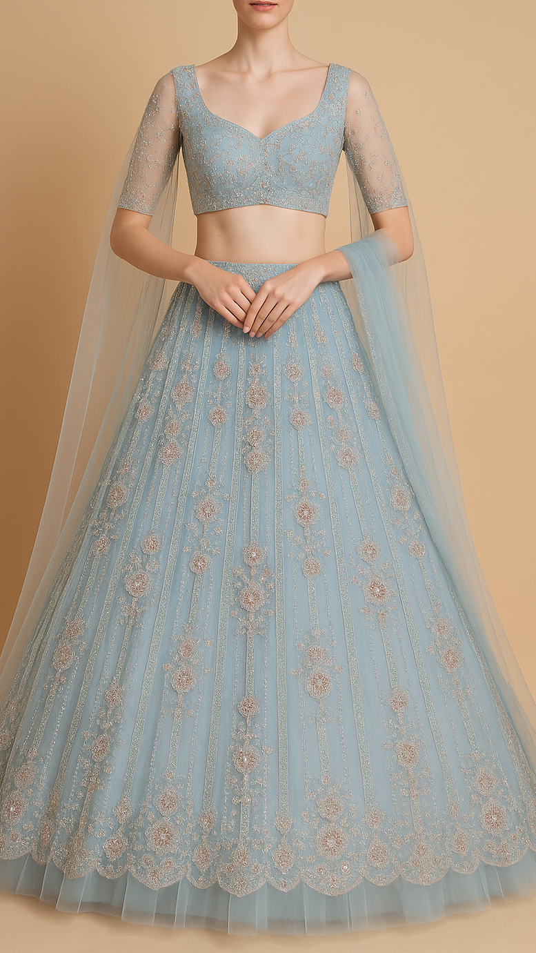 | Fabric Name | Powder Blue Imported Net Fabric With All Over Bead And Sequins Work |