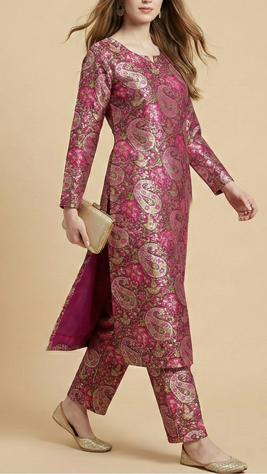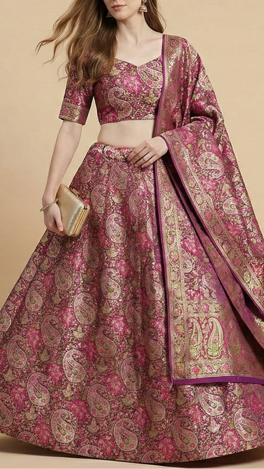 Ideal for sarees, lehengas, blouses, sherwanis, and ethnic jackets, this fabric captures the essence of royal tradition. Its detailed thread and golden zari weaving make it a perfect choice for weddings, receptions, and festive occasions.