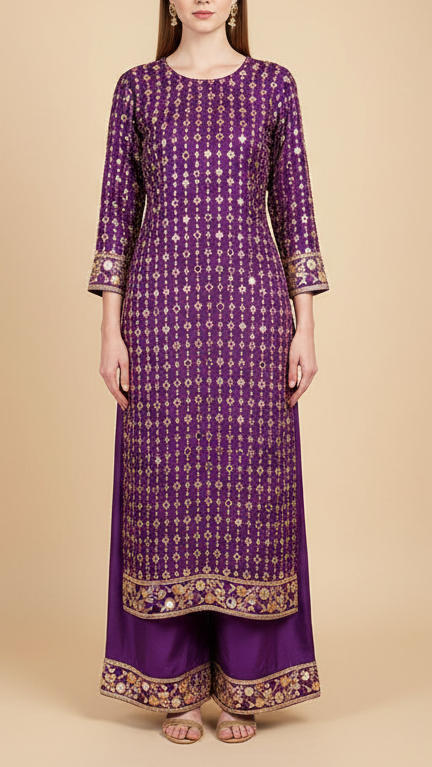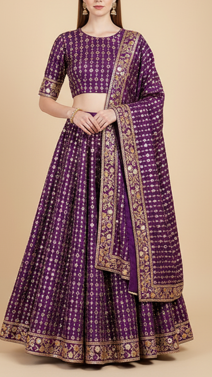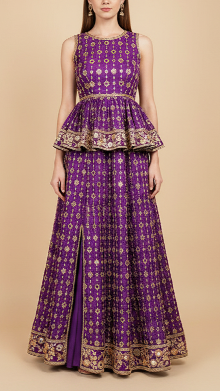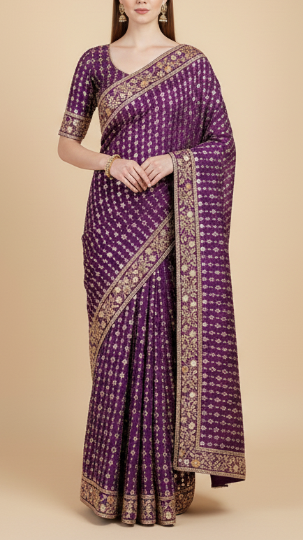 | Fabric Name | Purple Crepe Fabric With All Over Sequins, Katdana, Zari, Mirror And Bead Work With One Side Border |