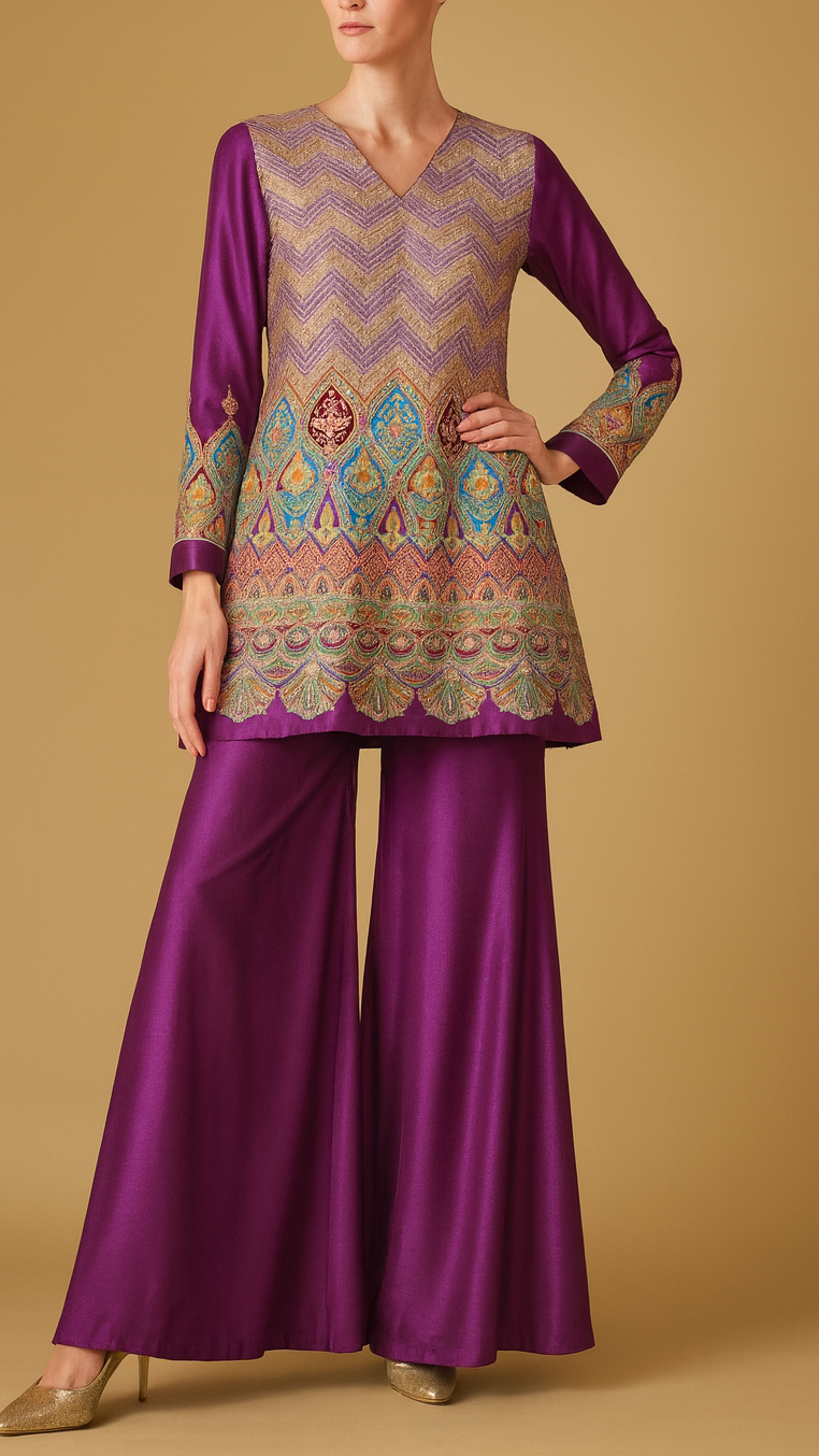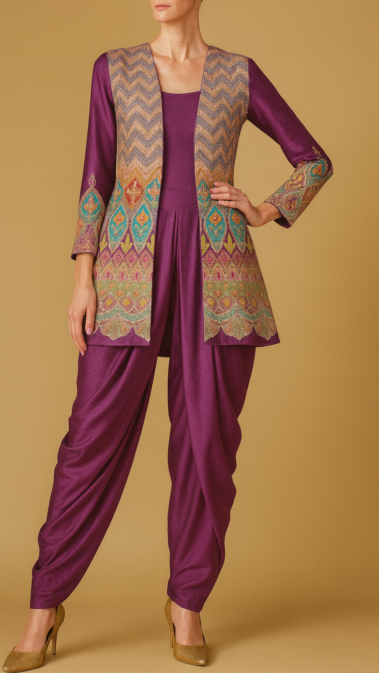 | Fabric Name | Purple Crepe Printed Fabric Embellished with Zari and Sequins with One-Side Heavy Border |
