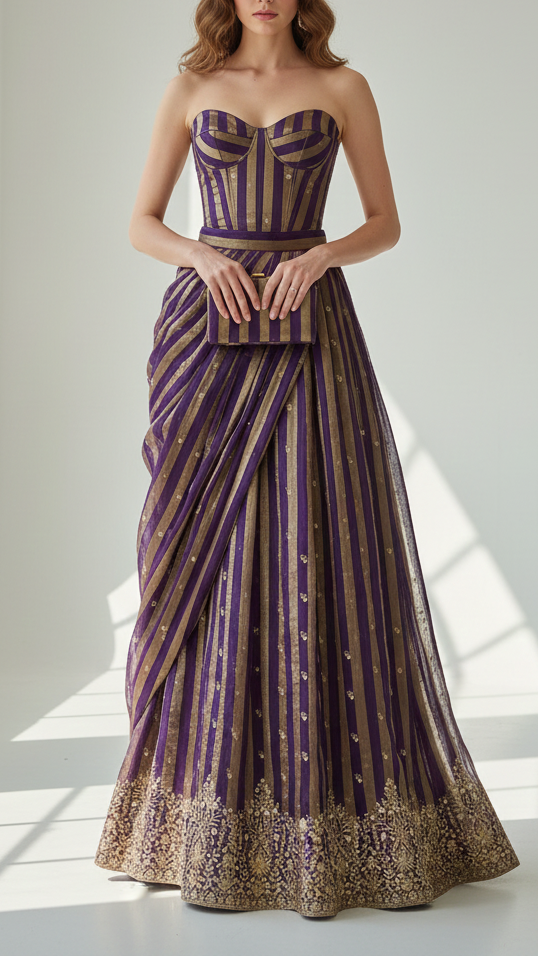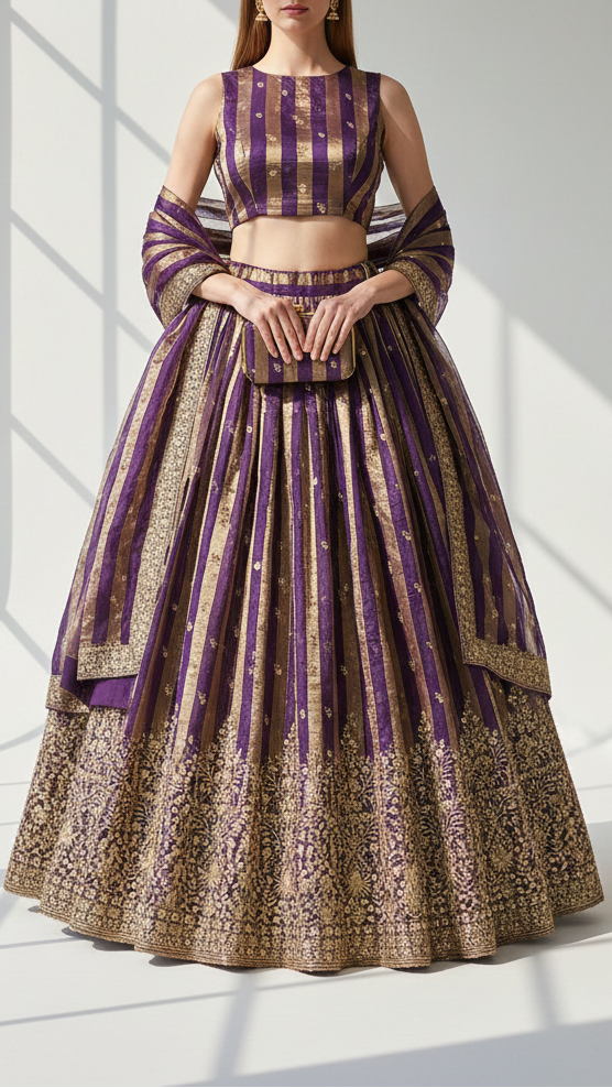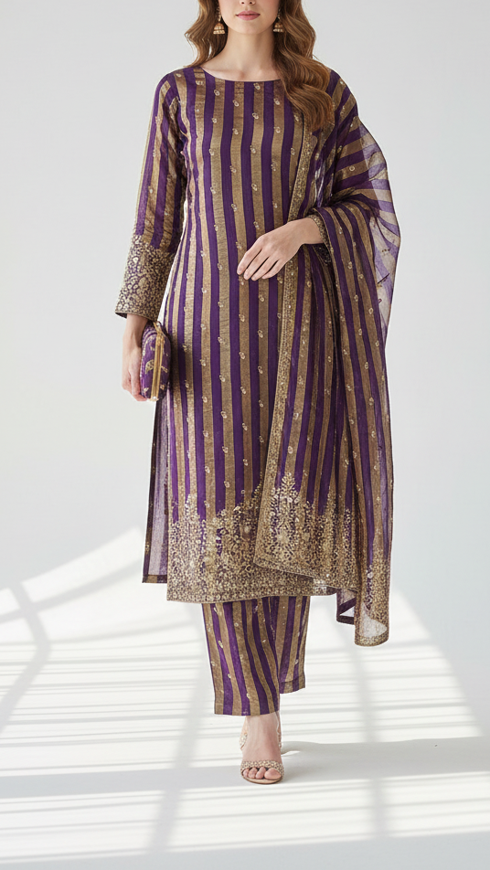 Perfect for sarees, dupattas, and layered drapes where a sophisticated striped base, subtle sparkle, and an ornate border create a graceful festive appeal.
