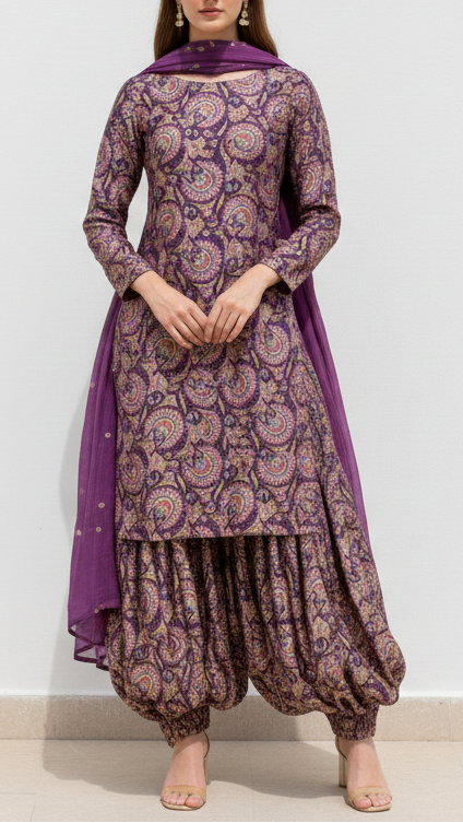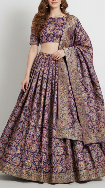 | Fabric Name | Purple Silk Fabric With Traditional Print With Golden Zari Work |