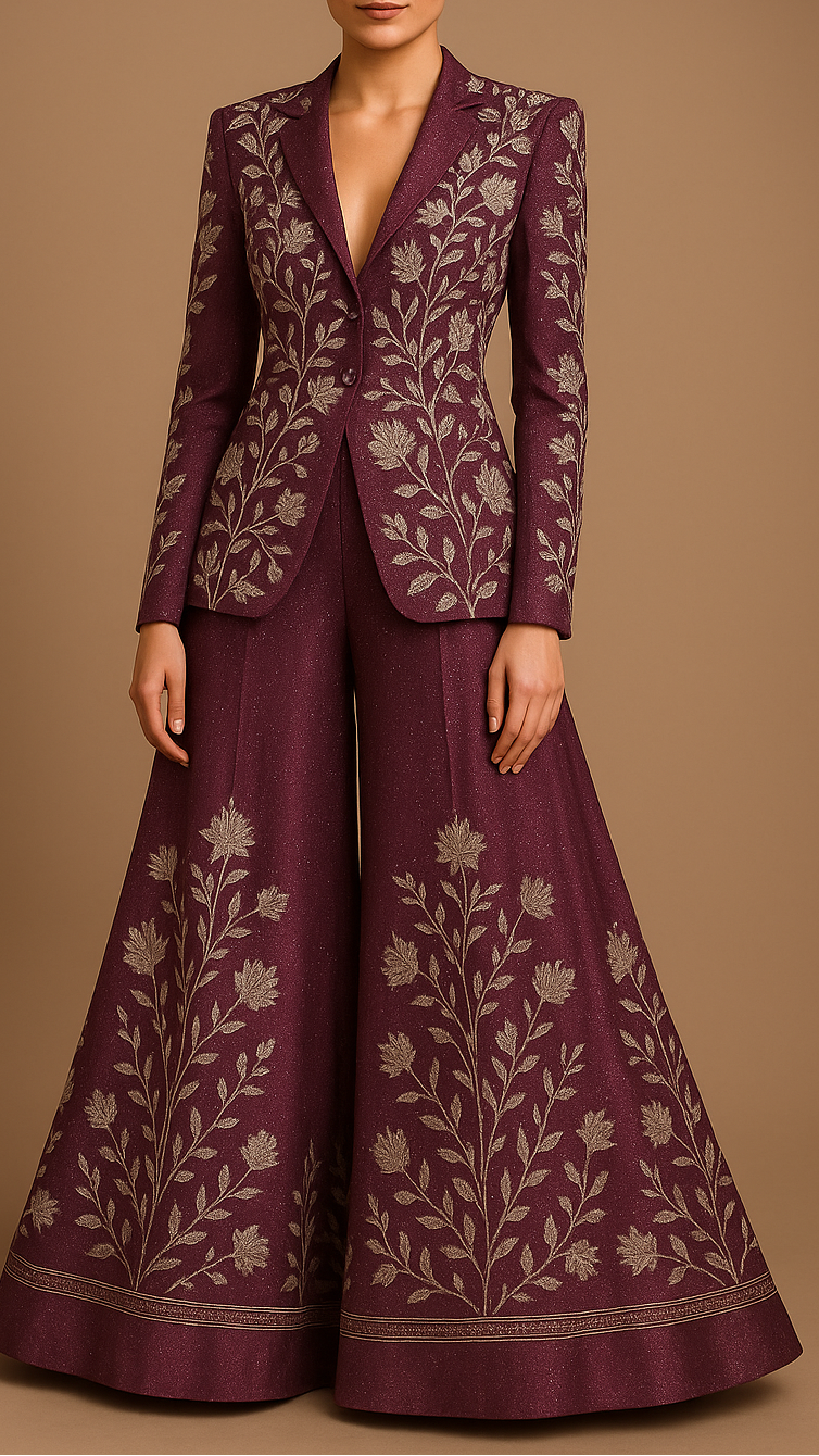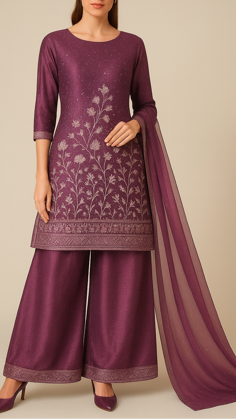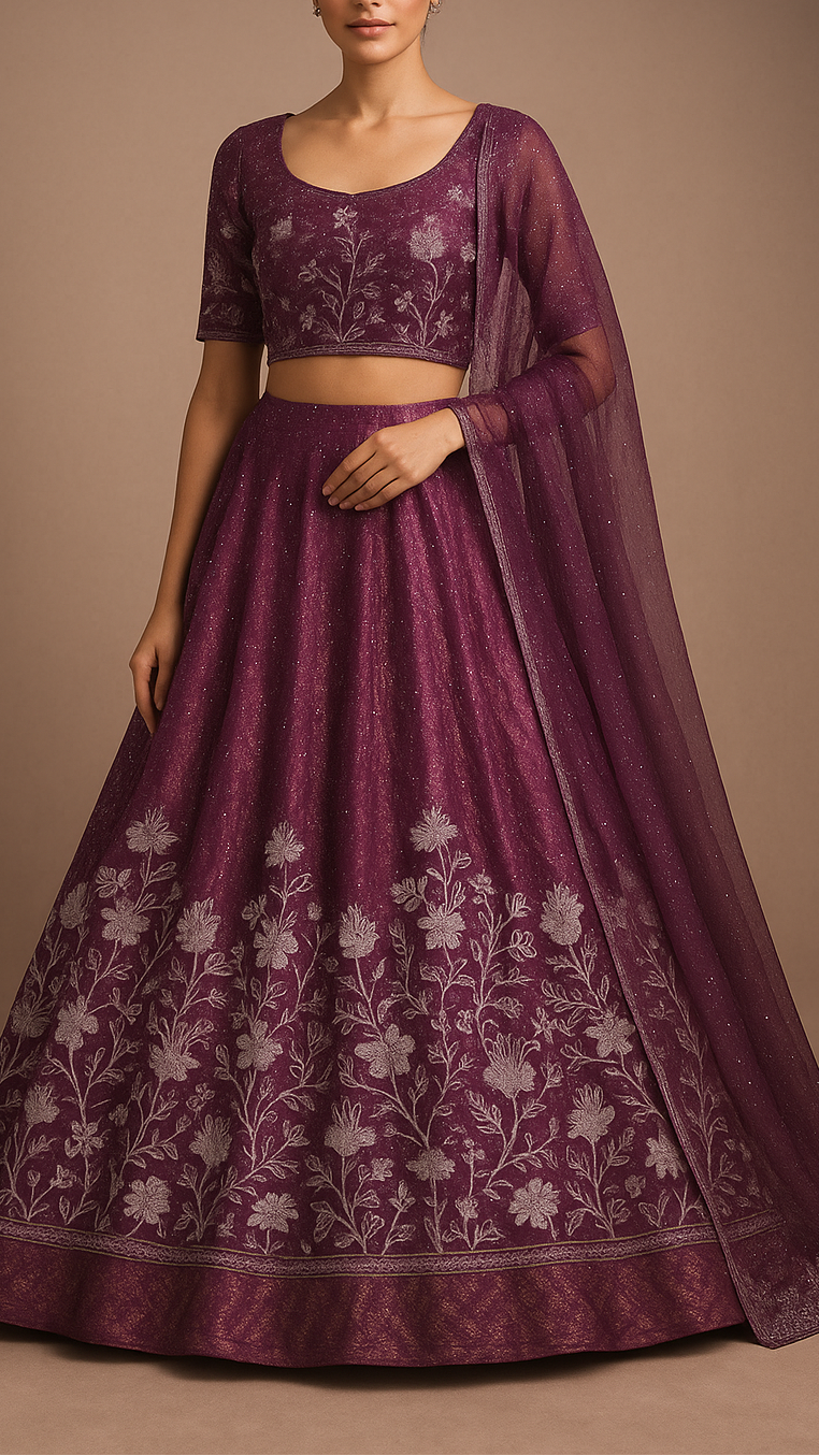 | Fabric Name | Purple Silk Tissue Fabric With All Over Swarovski Work With One Side Threadwork Border |