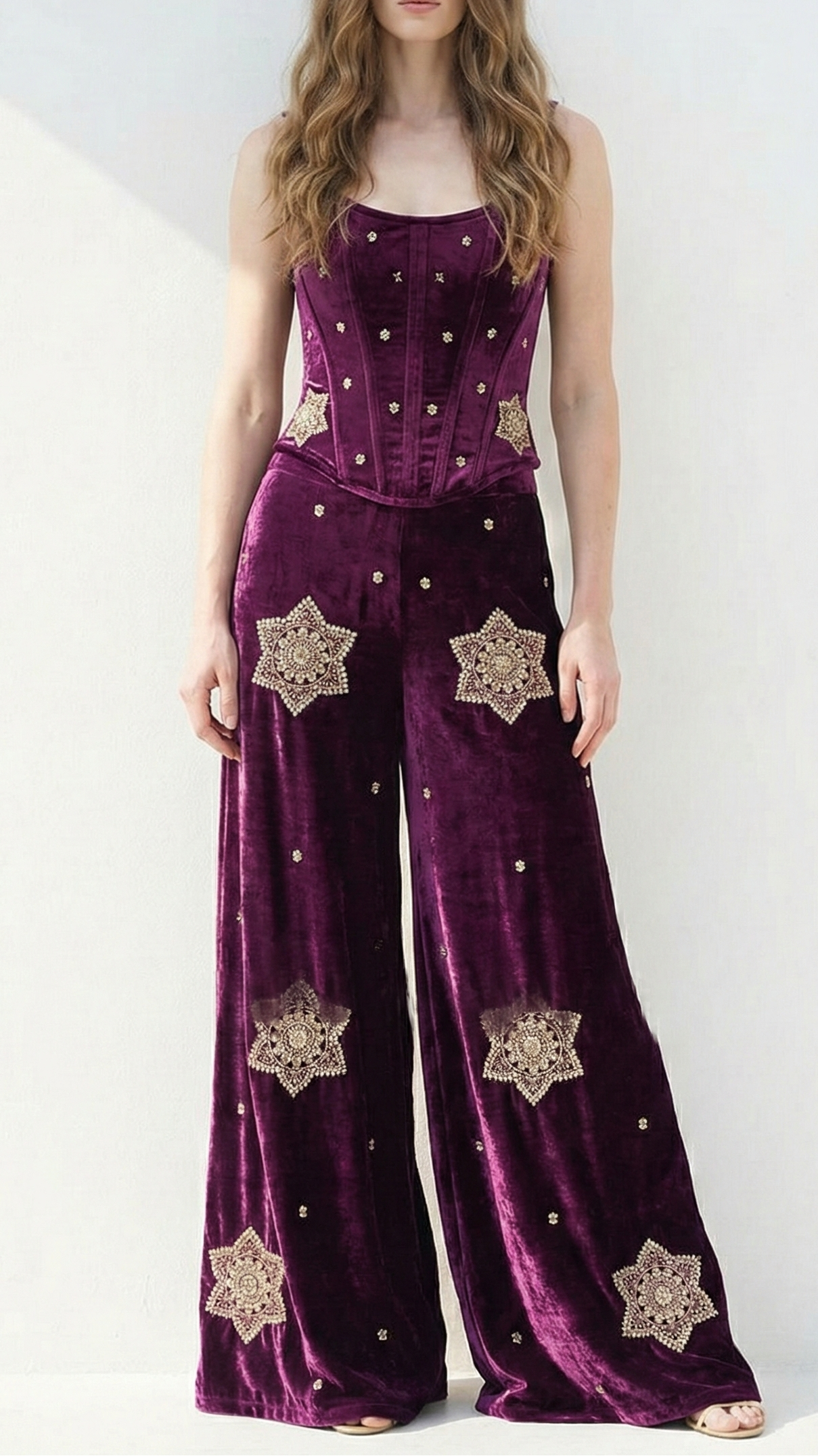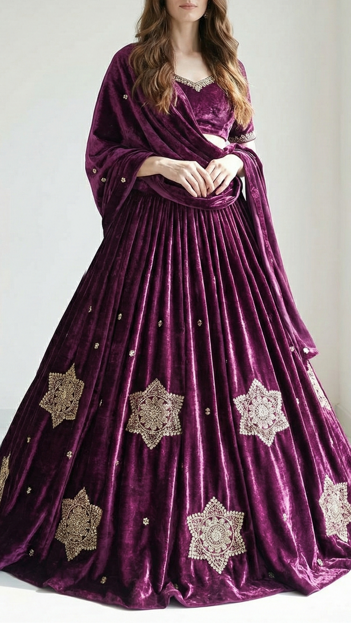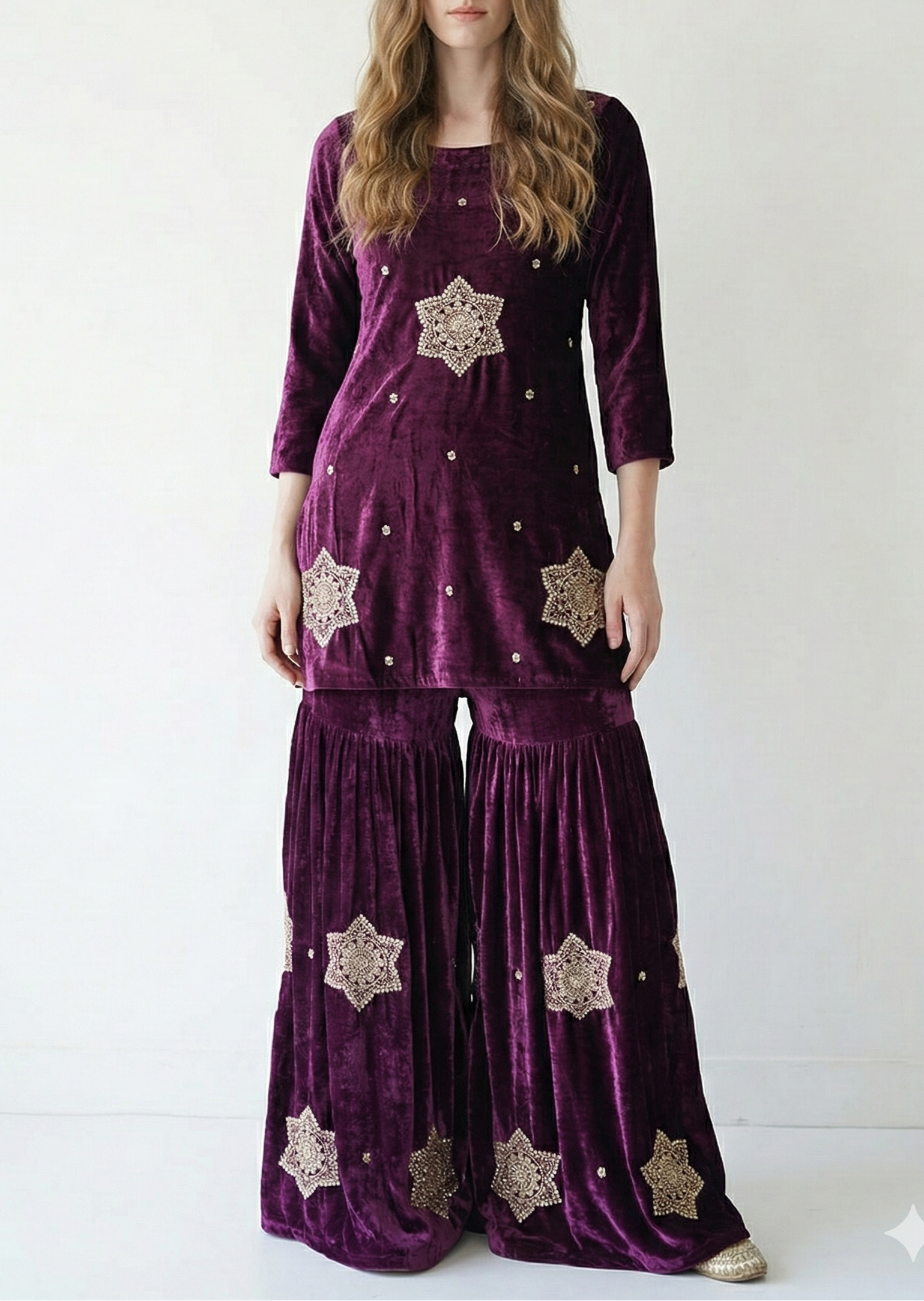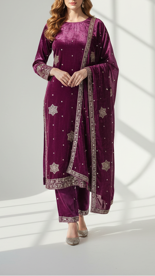| Fabric Name | Purple Velvet Fabric With All Over Buti Of Sequins, Katdana and Bead |