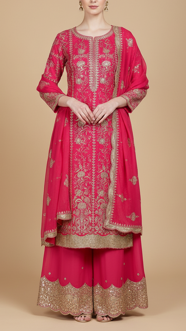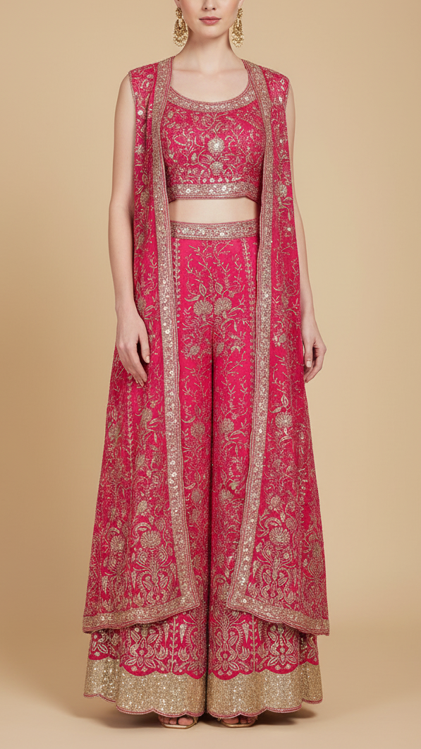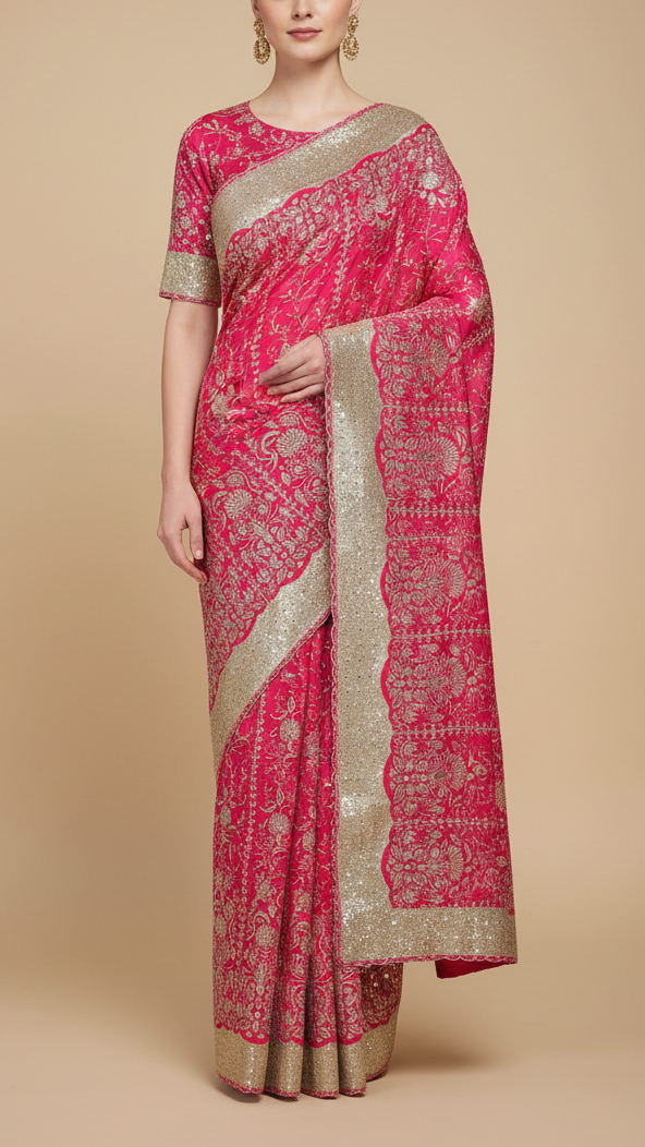 | Fabric Name | Rani Pink Georgette Fabric With All Over Zari And Sequins Work With One Side Border |