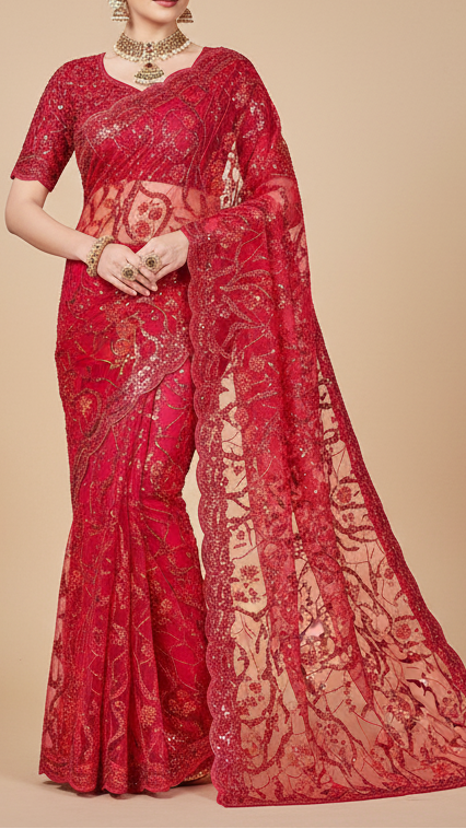 | Fabric Name | Rani Pink Imported Net Fabric with All Over Katdana, Bead, and Sequins Work |