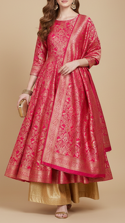 Perfect for sarees, anarkalis, jackets, ethinic jumpsuits, sherwani, etc. The rich look of this fabric is ideal for festive outfits, wedding attire & traditional wear.