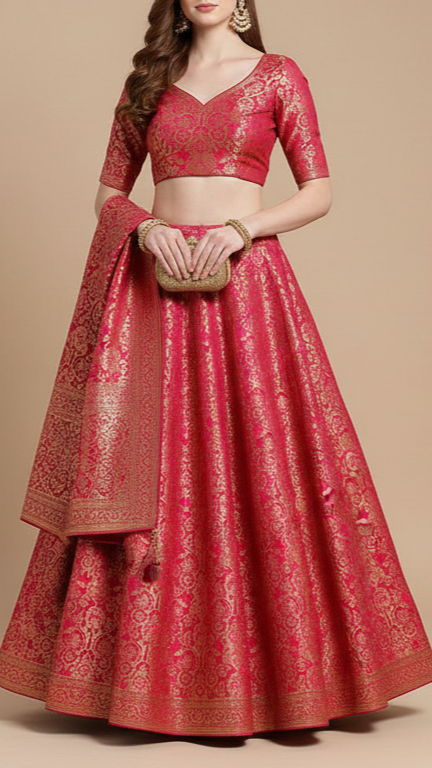 | Fabric Name | Rani Pink Banarasi Brocade Fabric With All Over Golden Zari Handloom |