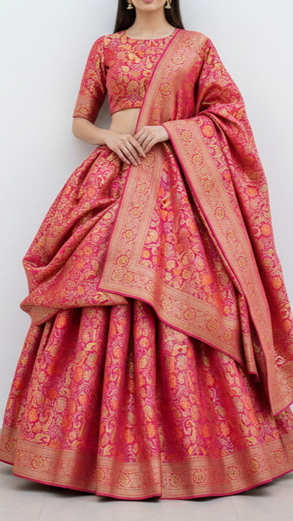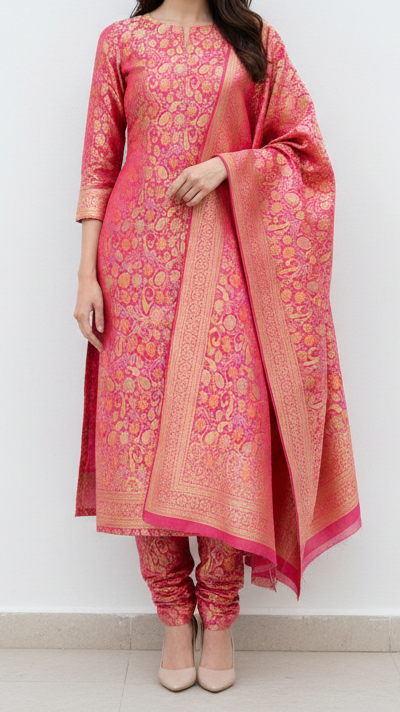 | Fabric Name | Rani Pink Banarasi Brocade Fabric With All Over Thread And Zari Handloom |