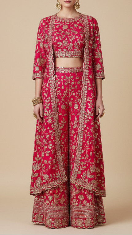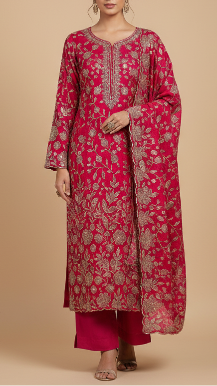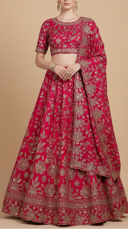 | Fabric Name | Rani Pink Crepe Fabric With All Over Sequins, Bead And Zari With One Side Scalloped Border |