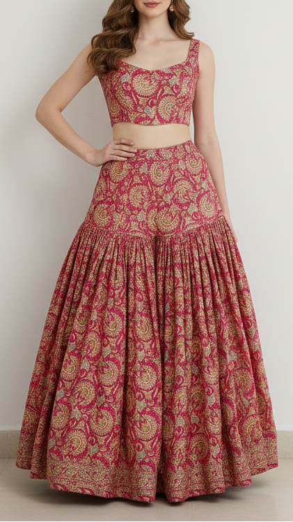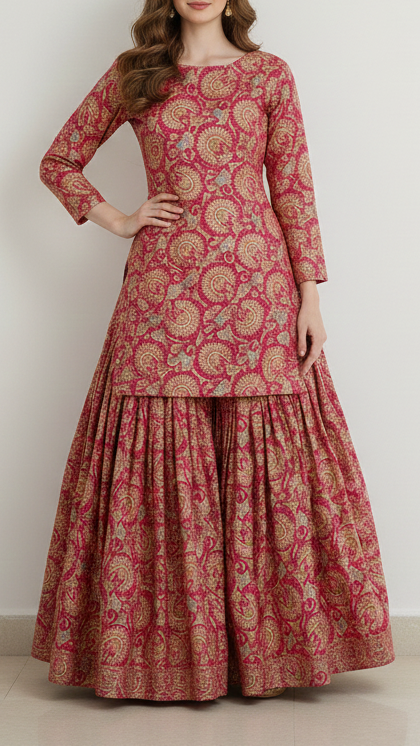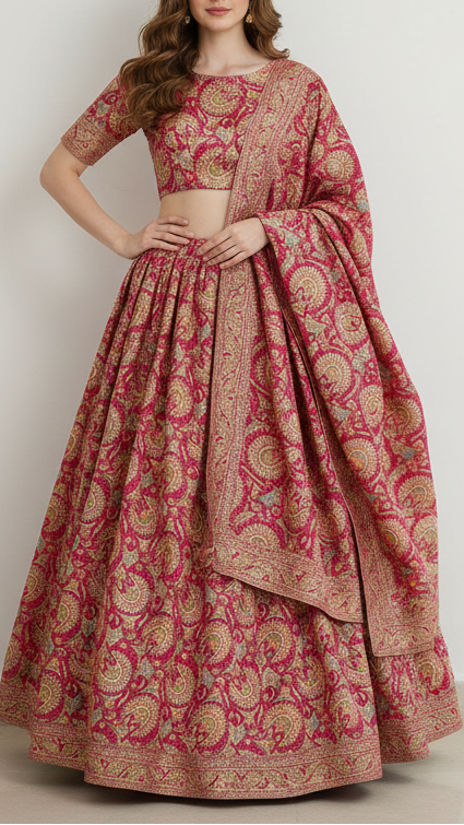 | Fabric Name | Rani Pink Silk Fabric With Traditional Print With Golden Zari Work |