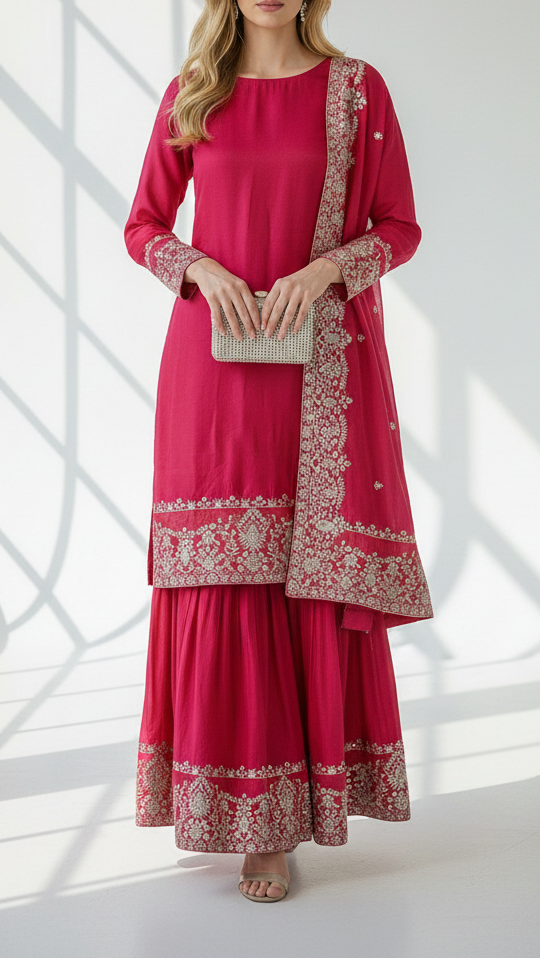 Rani Pink Tissue Fabric with Heavy Border of Zari and Sequins Work 20909