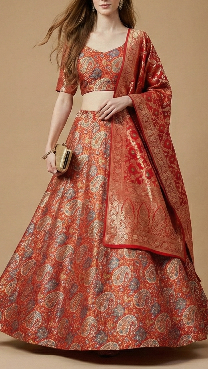 Ideal for sarees, lehengas, blouses, sherwanis, and ethnic jackets, this fabric captures the essence of royal tradition. Its detailed thread and golden zari weaving make it a perfect choice for weddings, receptions, and festive occasions.