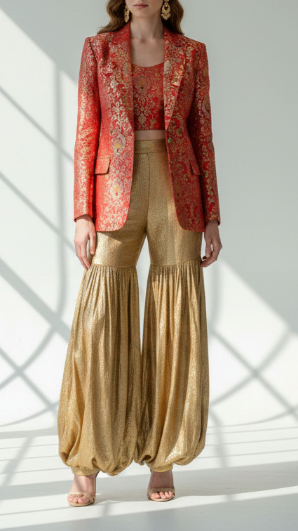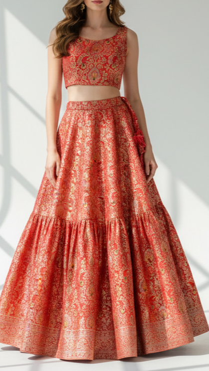 Perfect for lehenga, sarees, anarkalis, jackets, ethinic jumpsuits, sherwani, etc. The rich look of this fabric is ideal for festive outfits, wedding attire & traditional wear.
