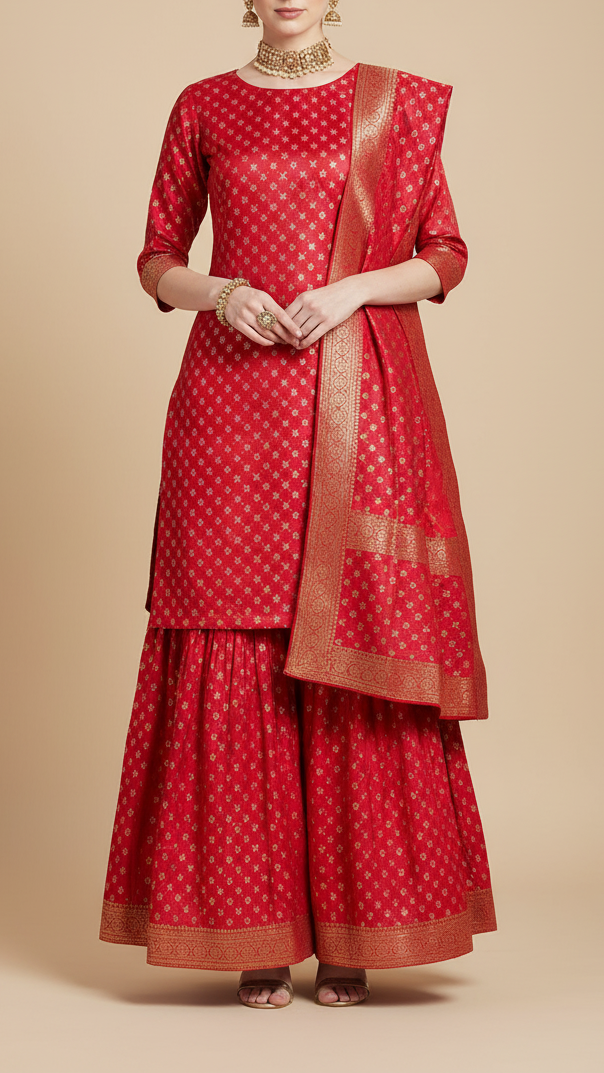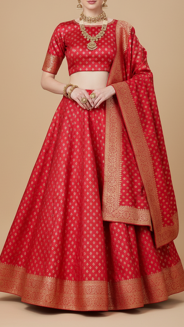 | Fabric Name | Red Banarasi Brocade Fabric with Allover Golden Zari Handloom |