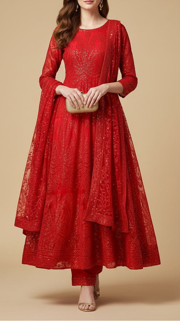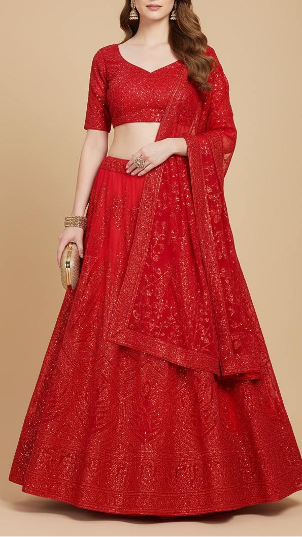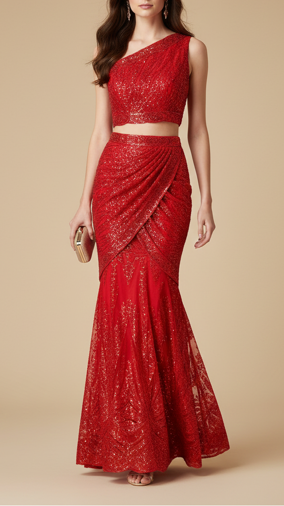 | Fabric Name | Red Georgette Fabric With All Over Sequins And Bead Work With One Side Heavy Border |