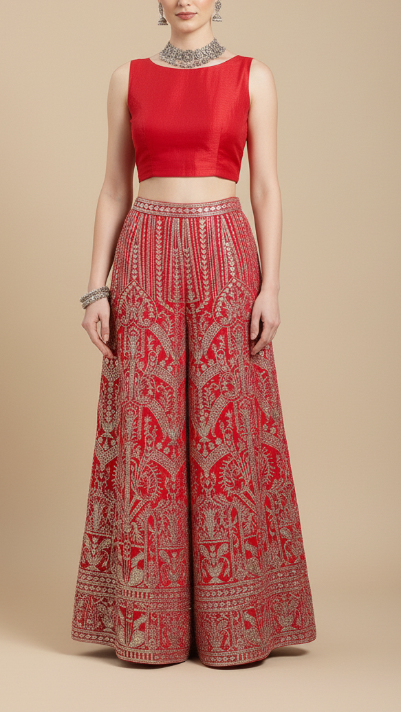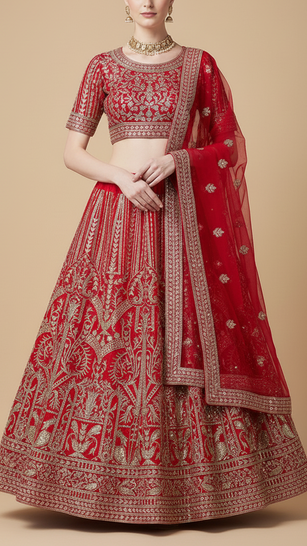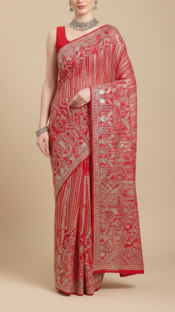 | Fabric Name | Red Georgette Fabric With All Over Zari And Sequins Work With One Side Border |