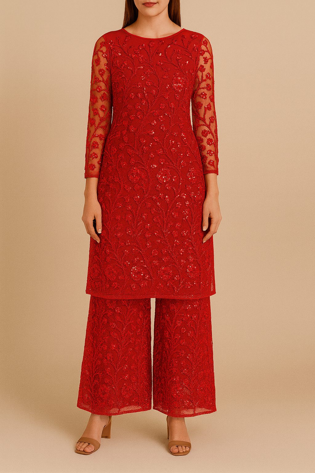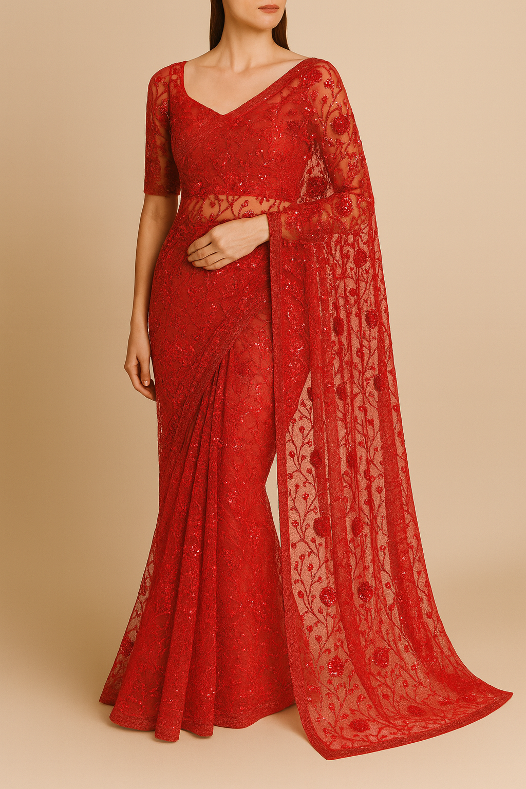 Red Imported Net Fabric With All Over Sequins And Katdana Work 16286