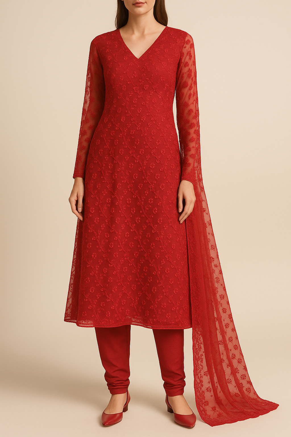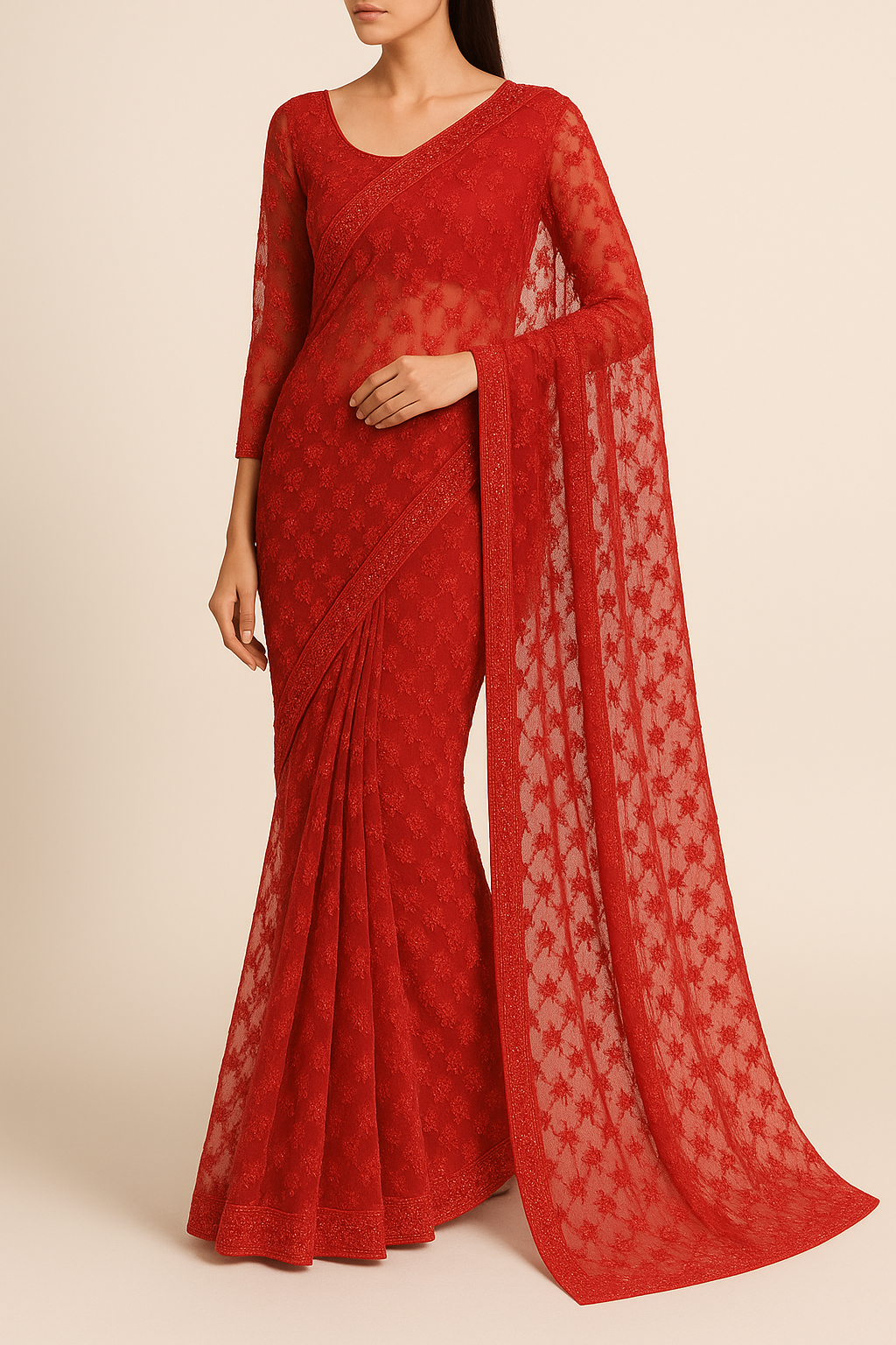 Red Imported Net Fabric With All Over Sequins And Katdana Work 16288