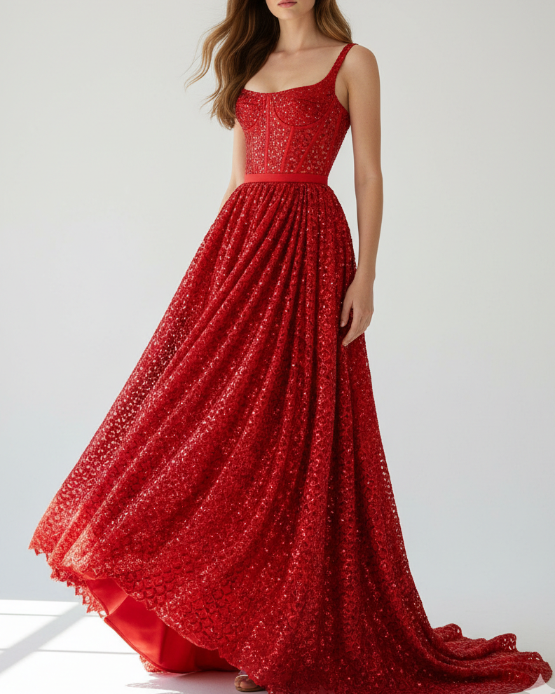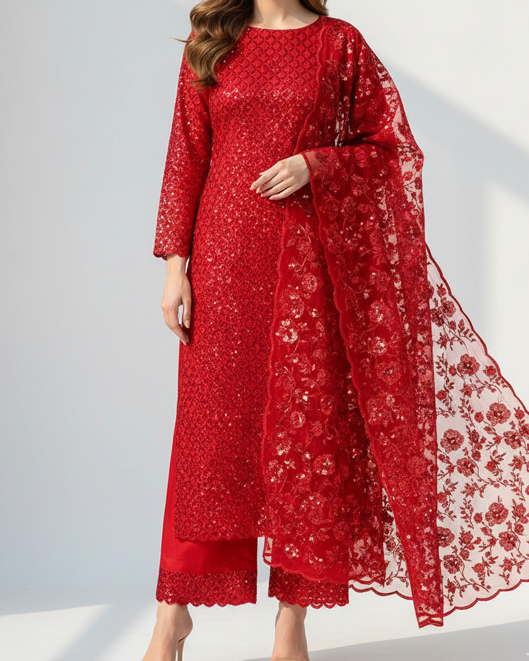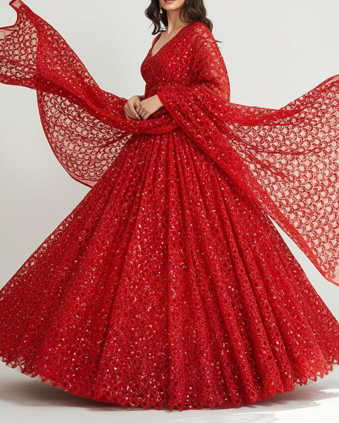 | Fabric Name | Red Imported Net Fabric With All Over Sequins, Katdana, Beads And Cut Work |